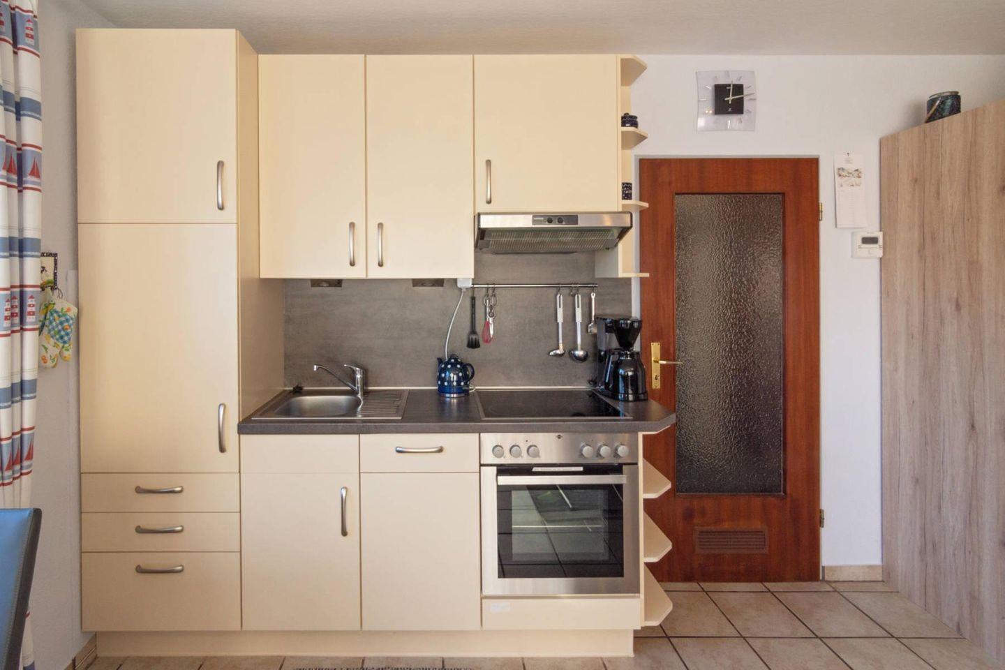 Die Erdgeschosswohnung verfügt über einen Wohn- und Essbereich mit voll ausgestatteter Küche, ein Schlafzimmer und ein Duschbad mit WC. Zur Wohnung gehört eine Terrasse mit Garten.