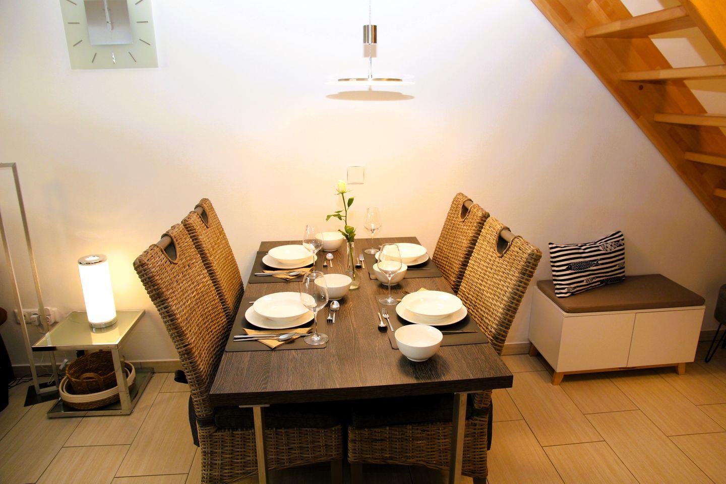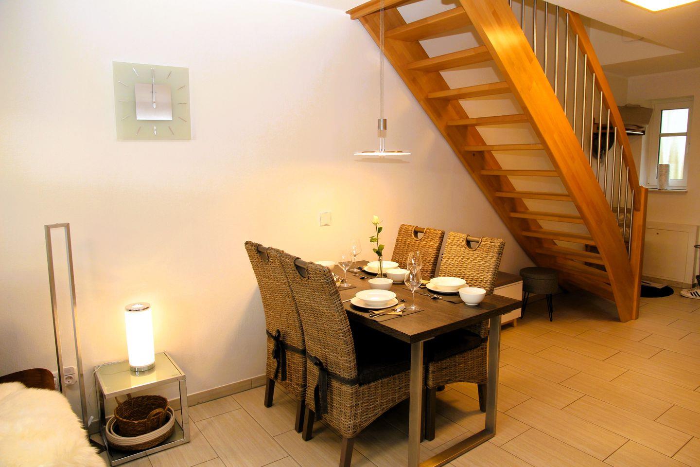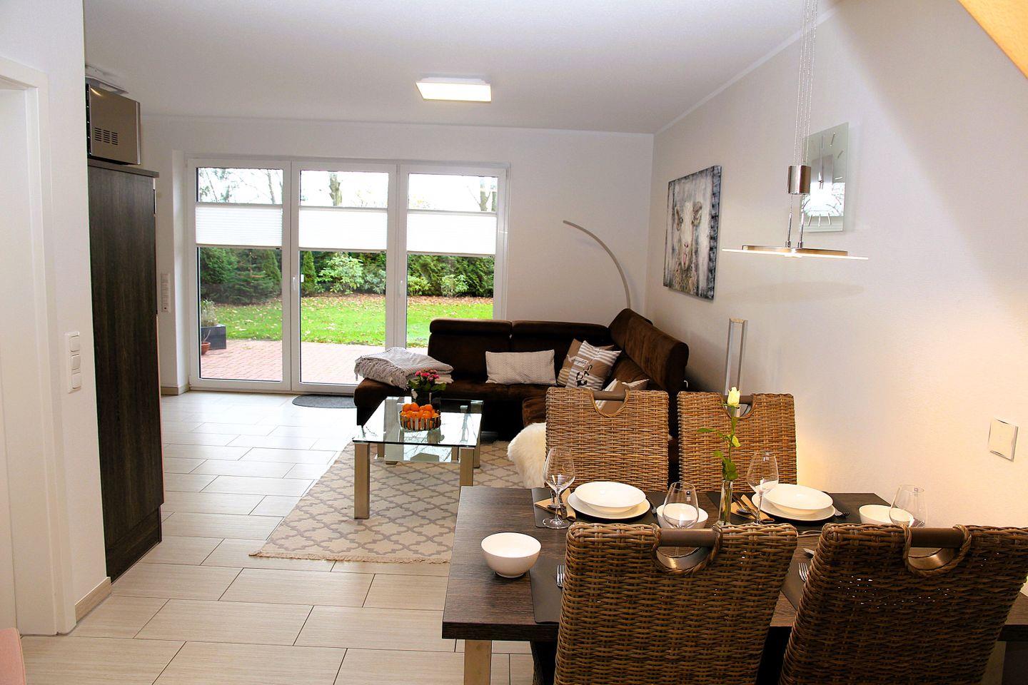 Im Erdgeschoss des Reihenendhauses befindet sich das Wohn-/Esszimmer mit einer vollständig ausgestatteten Einbauküche inkl. Geschirrspüler, Kühlschrank mit Gefrierfach, Mikrowelle, Induktionsherd mit Backofen, Kaffeemaschine, Wasserkocher, Toaster, Airfryer etc. Eine bequeme Wohnlandschaft, ein Esstisch mit vier Stühlen, ein Kinderhochstuhl sowie ein Geschirrschrank vervollständigen den Wohn-/Essbereich. Im Erdgeschoss befindet sich außerdem ein Tageslichtbad mit Dusche, Handtuchheizkörper und Föhn sowie ein Schlafzimmer mit Doppelbetten, Nachttischen, Sideboard, Fernseher und Kleiderschrank. Im Eingangsbereich ist eine praktische Garderobe inkl. Schuhregal vorhanden. Die modern eingerichtete, windgeschützte Terrasse ist vom Wohn-/Essbereich aus begehbar.