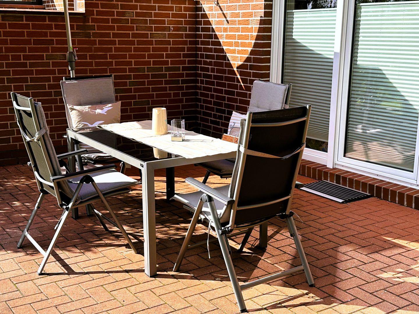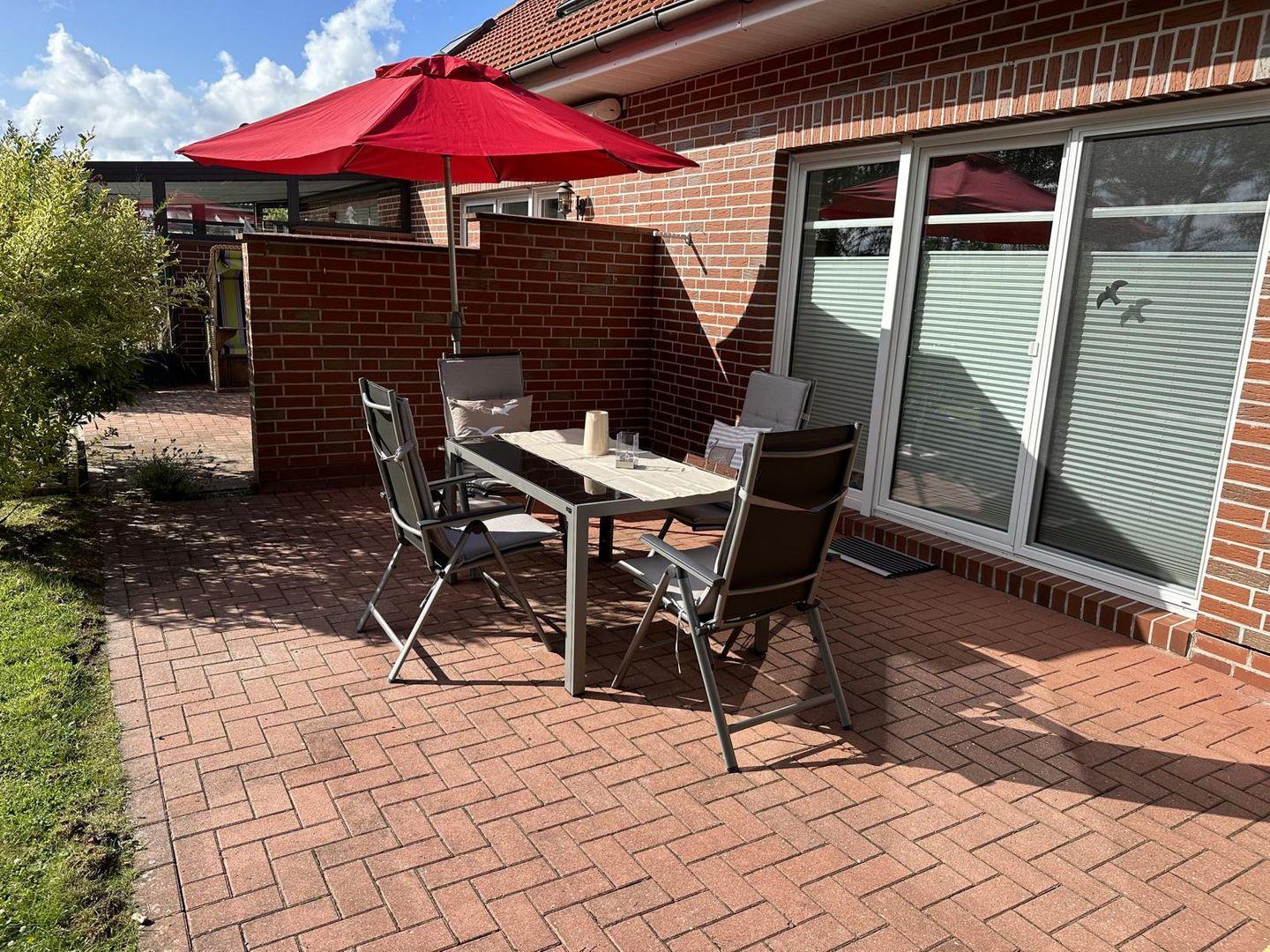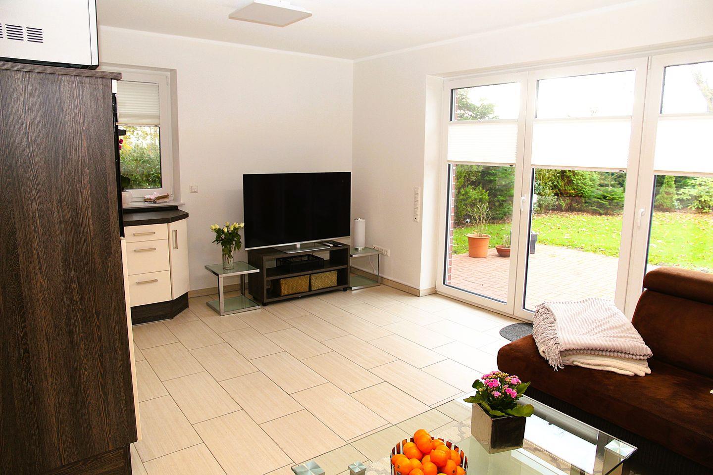 Im Erdgeschoss des Reihenendhauses befindet sich das Wohn-/Esszimmer mit einer vollständig ausgestatteten Einbauküche inkl. Geschirrspüler, Kühlschrank mit Gefrierfach, Mikrowelle, Induktionsherd mit Backofen, Kaffeemaschine, Wasserkocher, Toaster, Airfryer etc. Eine bequeme Wohnlandschaft, ein Esstisch mit vier Stühlen, ein Kinderhochstuhl sowie ein Geschirrschrank vervollständigen den Wohn-/Essbereich. Im Erdgeschoss befindet sich außerdem ein Tageslichtbad mit Dusche, Handtuchheizkörper und Föhn sowie ein Schlafzimmer mit Doppelbetten, Nachttischen, Sideboard, Fernseher und Kleiderschrank. Im Eingangsbereich ist eine praktische Garderobe inkl. Schuhregal vorhanden. Die modern eingerichtete, windgeschützte Terrasse ist vom Wohn-/Essbereich aus begehbar.