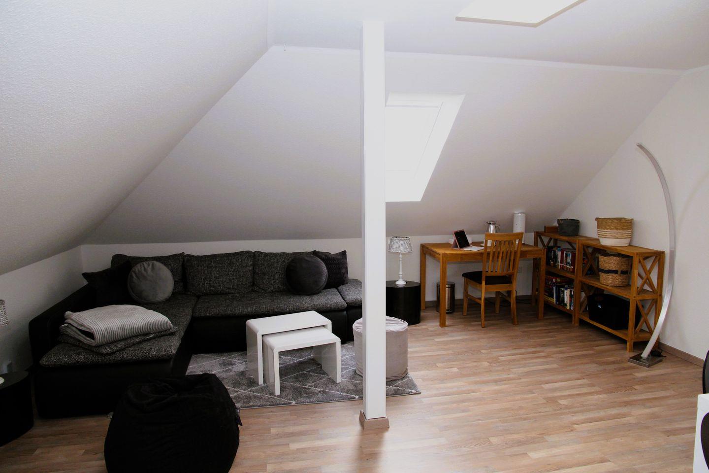 Im Obergeschoß befindet sich ein großzügig geschnittenes Wohn-/Schlafzimmer mit zwei Einzelbetten. Ein Kinderreisebett mit zusätzlicher Matratze ist ebenfalls vorhanden. Eine bequeme Wohnlandschaft sowie ein XL-Sitzsack vervollständigen die Ausstattung im Obergeschoss. Sowohl im Wohn-/Esszimmer als auch in beiden Schlafzimmern (Erdgeschoss/Obergeschoss) ist Sat-TV mit Flachbildfernsehern vorhanden. Alle Dachfenster sind mit Insektenschutz-Rollos ausgestattet.
