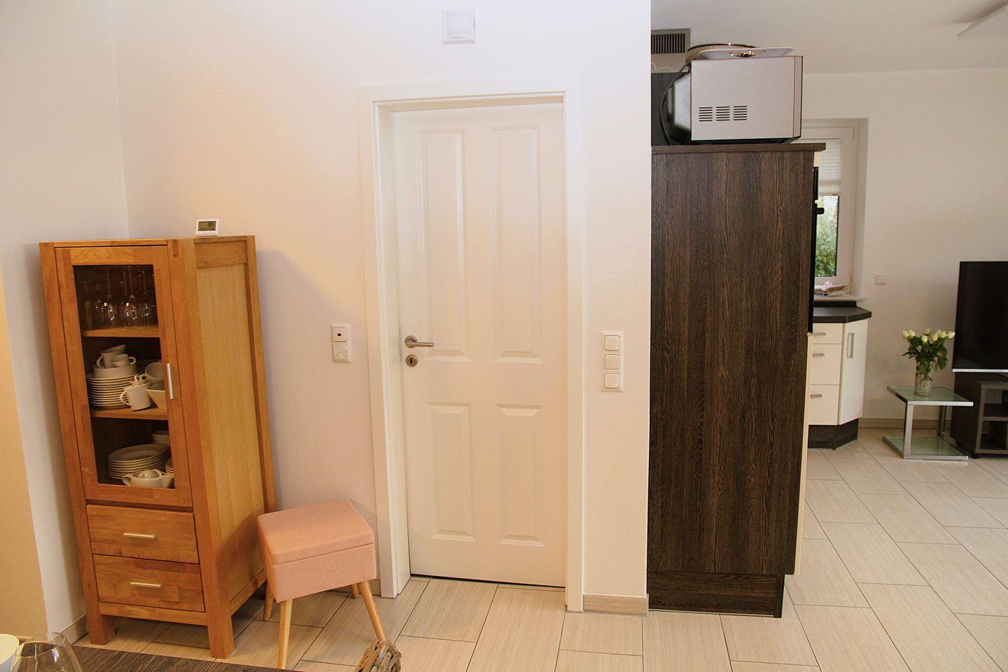 Im Anbau seitlich zum Gebäude befindet sich ein abschließbarer Abstellraum mit Staubsauger, Waschmaschine, Trockner und Wäscheständer. Hier können ggf. angemietete Fahrräder, Sportgeräte und Getränke untergebracht werden.