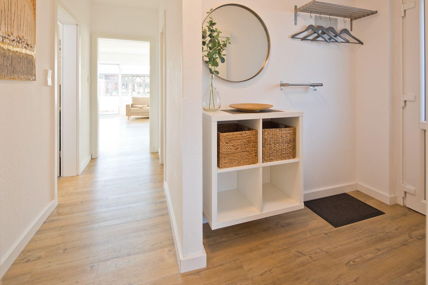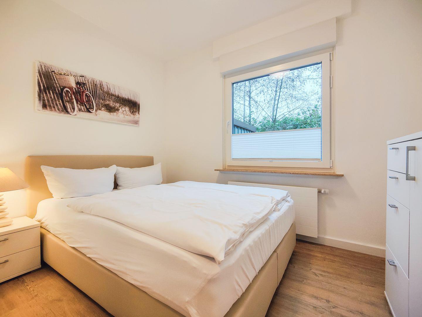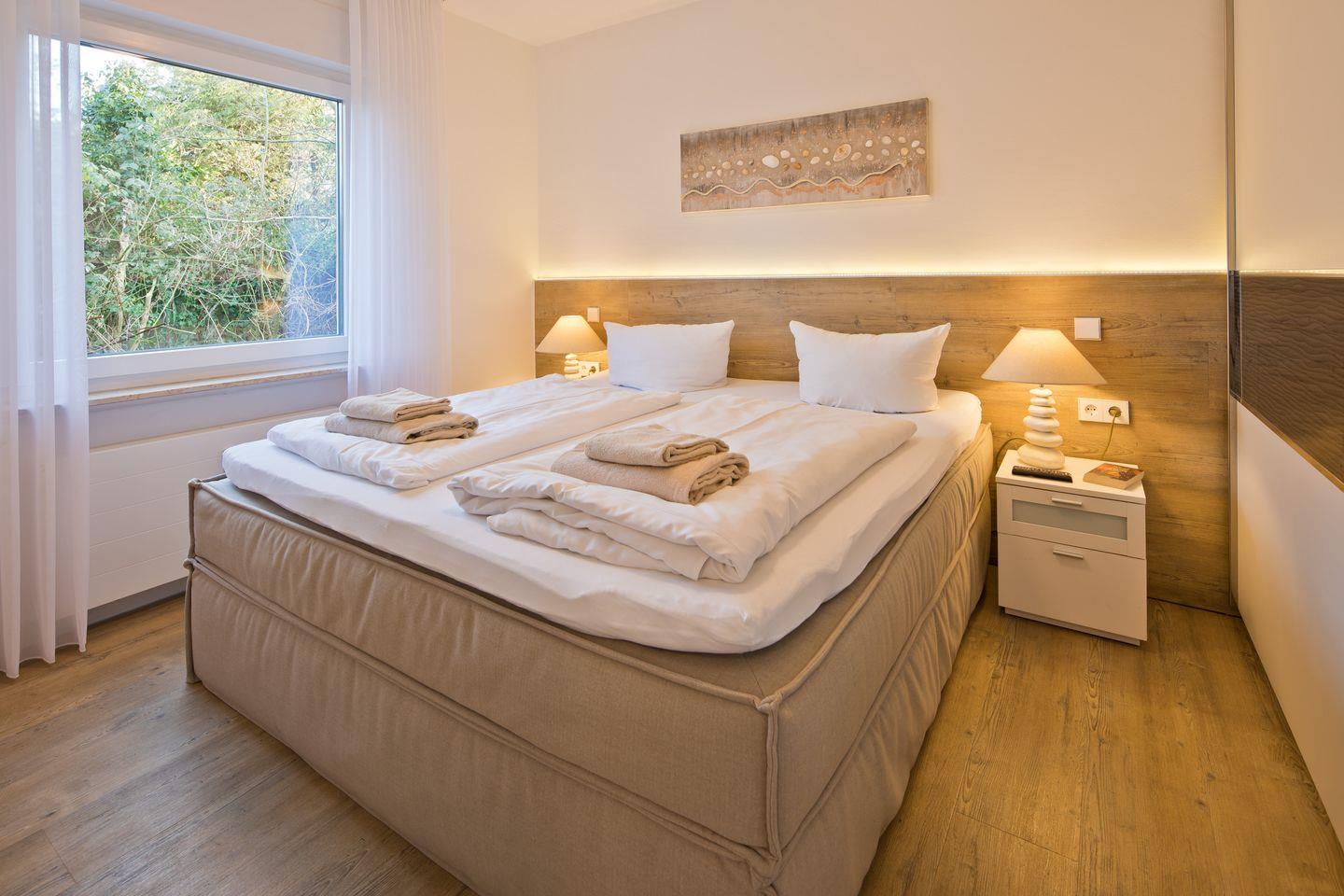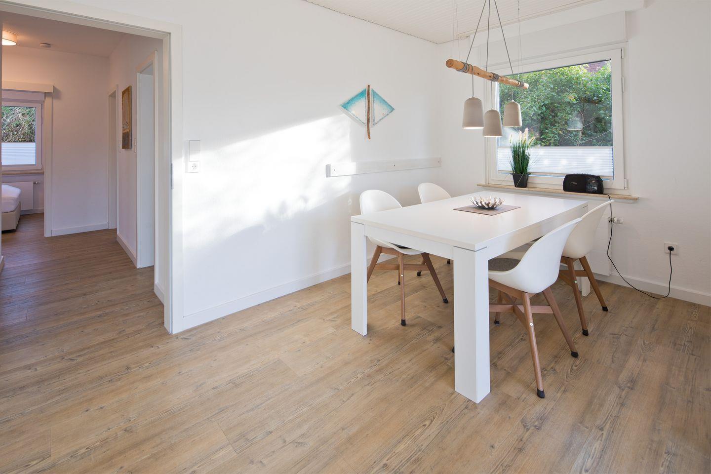 Herzlich willkommen in der neu eingerichteten Ferienwohnung im Erdgeschoss. Hier können Sie es sich mit bis zu 4 Personen gemütlich machen. Es erwartet Sie ein heller Wohnraum mit bequemer Couch, 55" Curved-Smart-TV, Radio und Essplatz. Von hier aus haben Sie Zugang auf den sonnigen Südwestbalkon. In der Küche finden Sie neben einem Backofen, Spülmaschine, Mikrowelle und Kaffeemaschine auch noch viele weitere nützliche Küchengeräte vor. Das WLAN ist schnell und kostenlos! Über den großzügigen Flur gelangen Sie in eines der behaglichen Schlafräume, ausgestattet mit einem hochwertigen Boxspringbett (180x200), einem großem Kleiderschrank und TV. Das zweite Schlafzimmer ist mit zwei Einzelbetten ausgestattet und verfügt über eine Kommode. Das neue Tageslichtbad verfügt über eine bodengleiche begehbare Dusche, Waschbecken, Handtuchheizung, WC und eine Waschmaschine. Mit individuellen Akzenten, Bildern und Ideen haben wir auch diese Wohnung mit viel Energie und Freude für Sie renoviert.