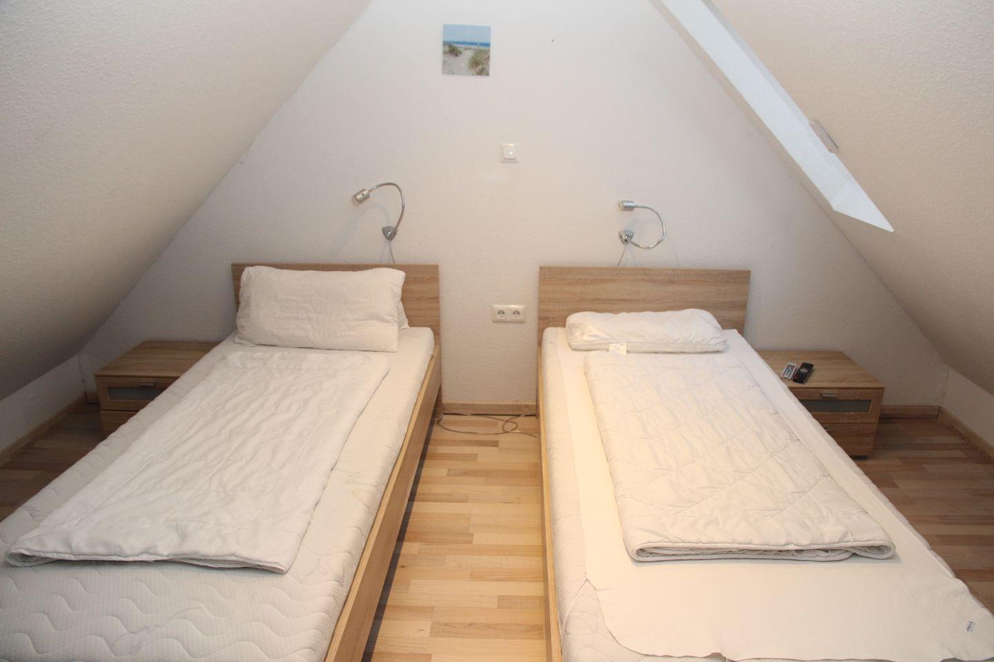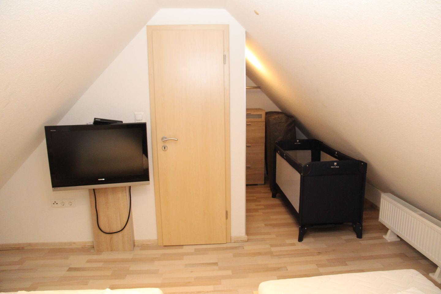 Im ausgebauten Dachgeschoss befindet sich das zweite Schlafzimmer mit zwei Einzelbetten, einem zweiten TV, ein Babybett und weitere Unterbringungsmöglichkeiten. Auch ein Kinderhochstuhl sowie das o.g. Babybett stehen Ihnen kostenfrei zur Verfügung.