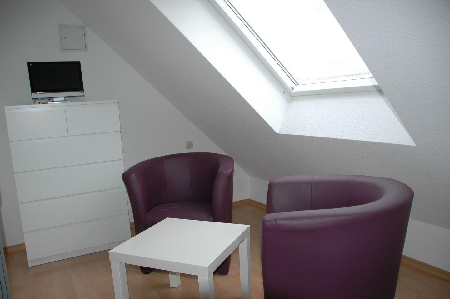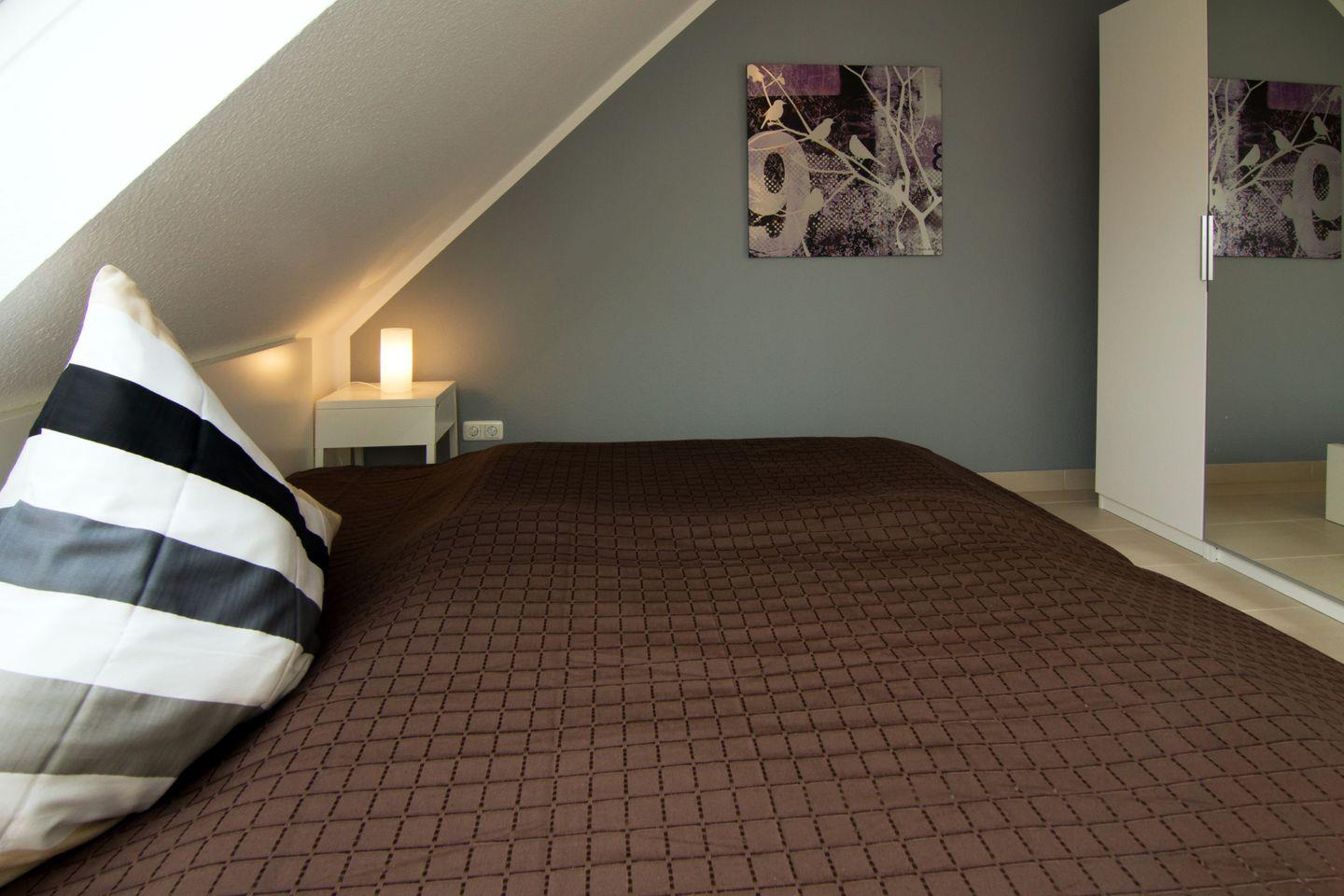 Weiter gehören zur Wohnung 2 freundliche Schlafzimmer, eins mit Doppelbett, das zweite im ausgebauten Dachgeschoß über eine Raumspartreppe zu erreichen. Das Badezimmer hat eine Dusche, Waschbecken und WC.