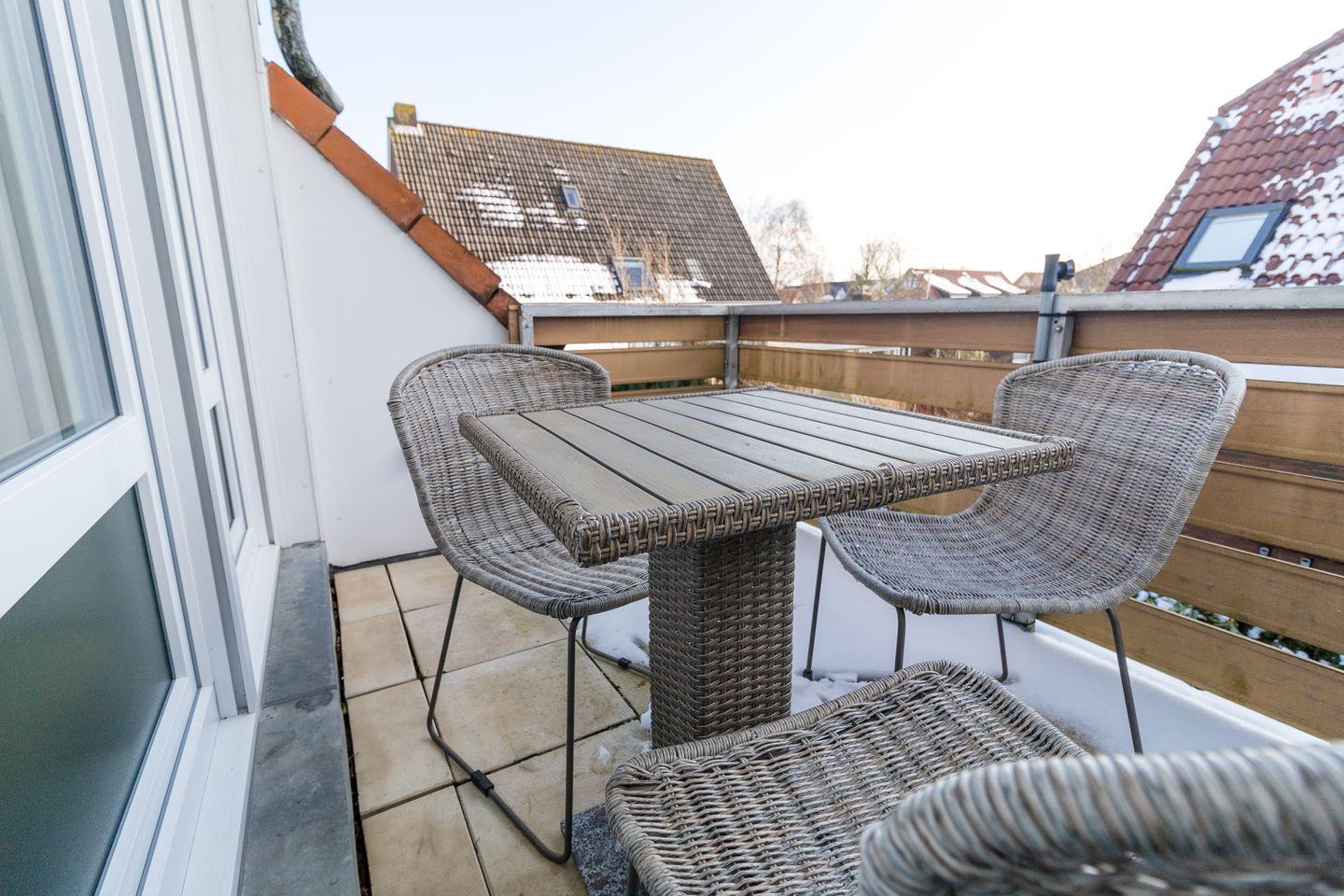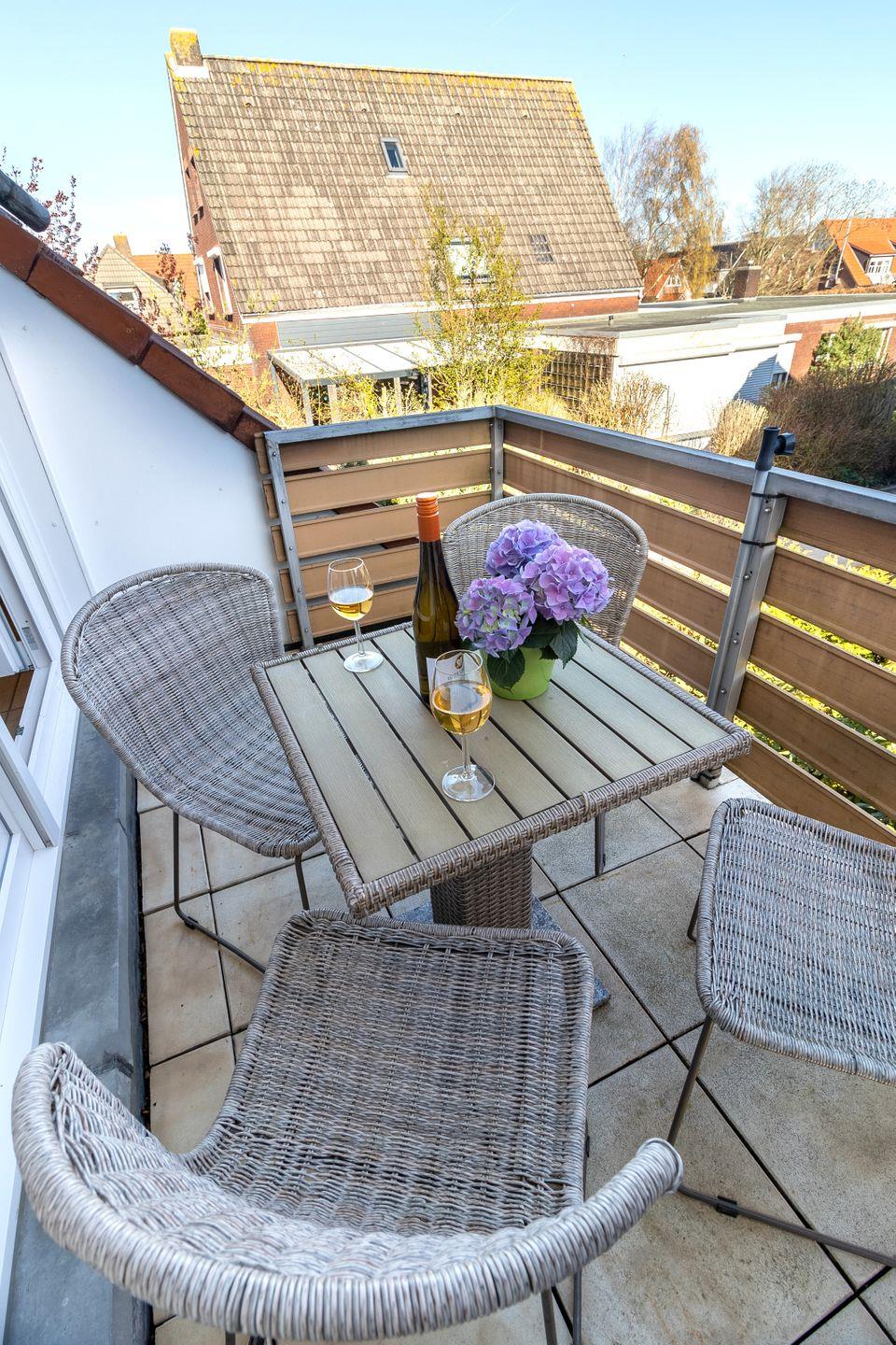 Der Balkon ist zur Südseite gelegen und mit bequemen Gartenmöbeln ausgestattet. Hier können Sie Ihr Frühstück in der Sonne genießen oder an lauen Sommerabenden bei einem kühlen Glas Wein verweilen.