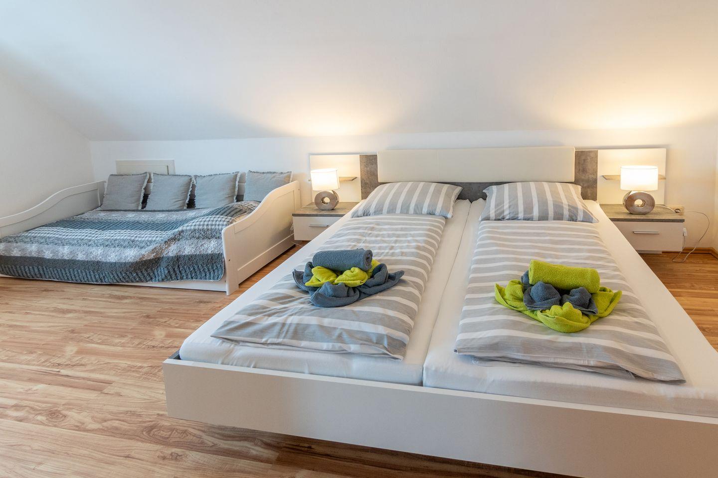 Das Erdgeschoss bietet Platz für 4 Personen + Kleinkind und im Obergeschoss ist weiterer Platz für 5 Personen.