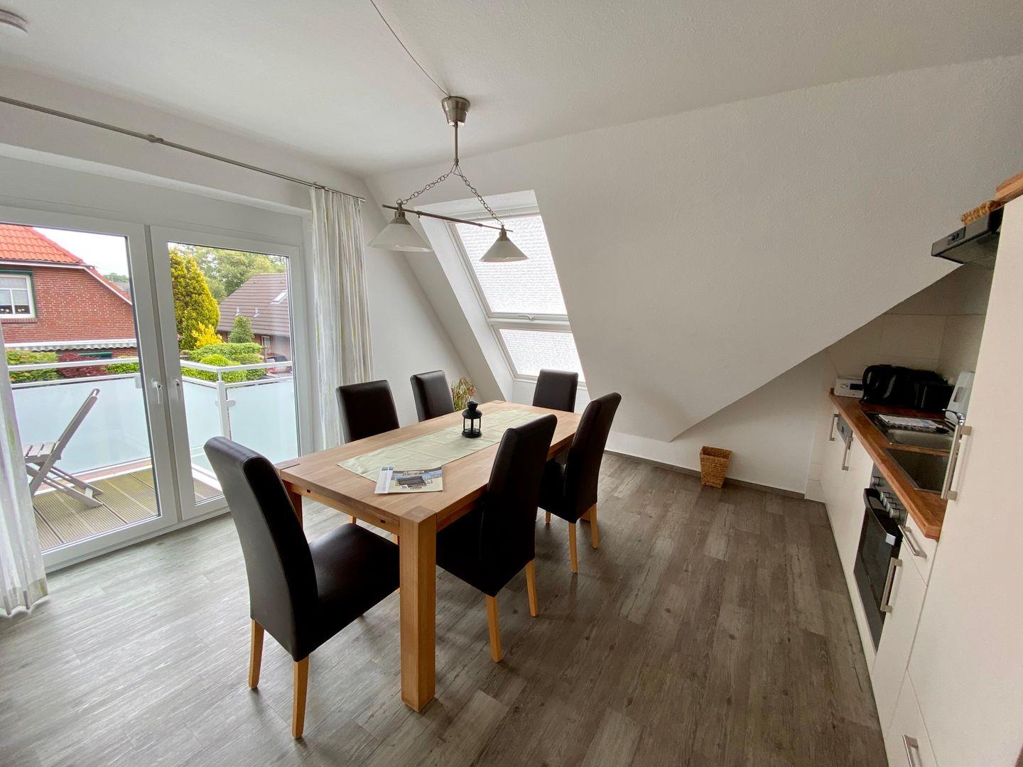 Sowohl das Wohnzimmer als auch die Küche verfügen über jeweils zwei große bodentiefe Fenster mit Zugang zum Balkon. Genießen Sie hier Dank der Ost-Ausrichtung ein sonniges Frühstück. Mit unserem Elektro-Grill ist auch Grillen an der frischen Nordseeluft kein Problem. Über einen Privatweg können ausschließlich die Gäste unseres Ferienhauses nach nur 50m zur Norddeicher Straße gelangen, wo Sie viele Restaurants, Cafés und Geschäfte vorfinden. Im Außenbereich haben Sie außerdem die Möglichkeit, Ihre Fahrräder oder anderen Gegenstände in einem großen, abschließbaren Gartenhaus unterzubringen. E-Bikes können im Gartenhaus an zahlreichen Steckdosen kostenlos aufgeladen werden.