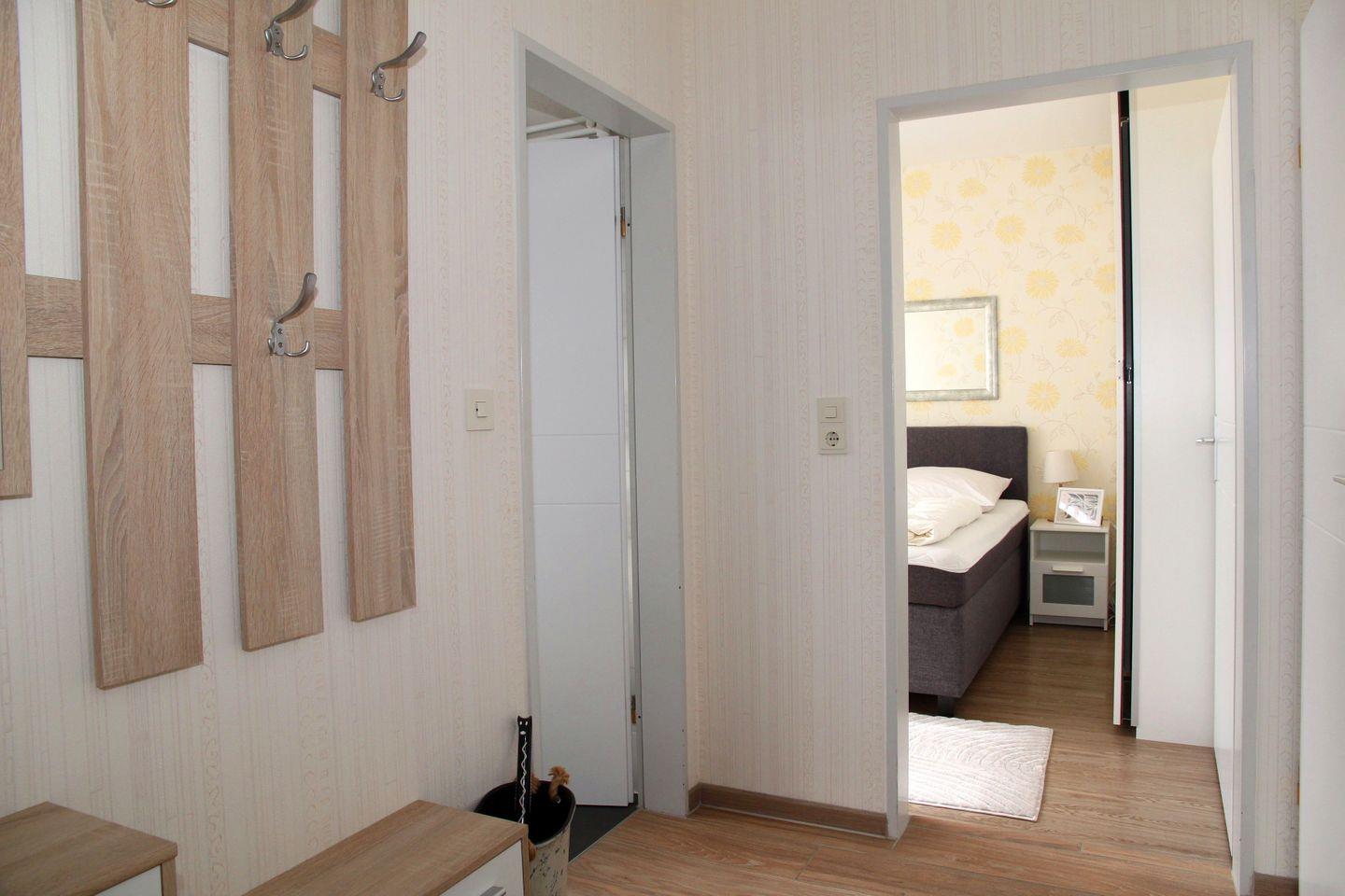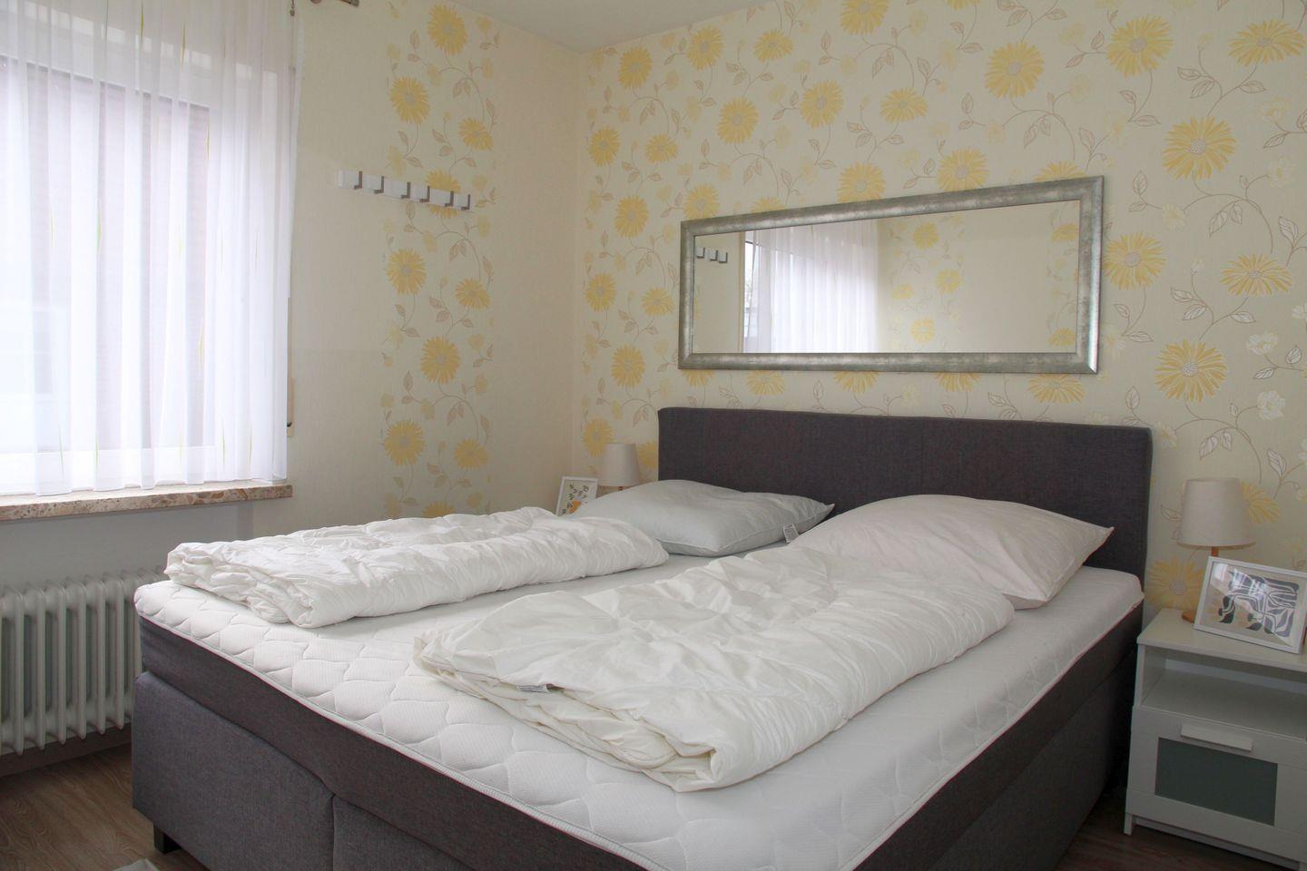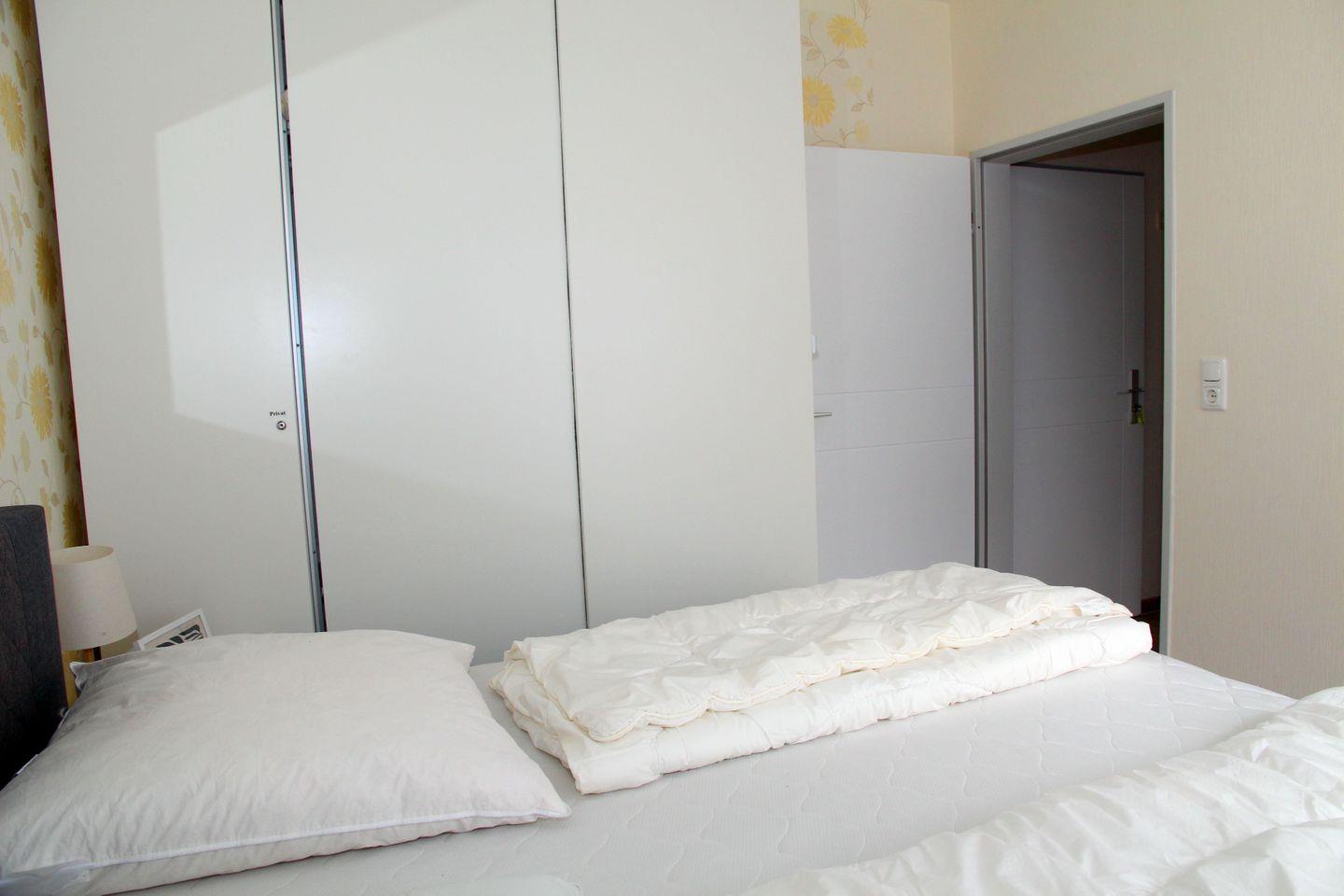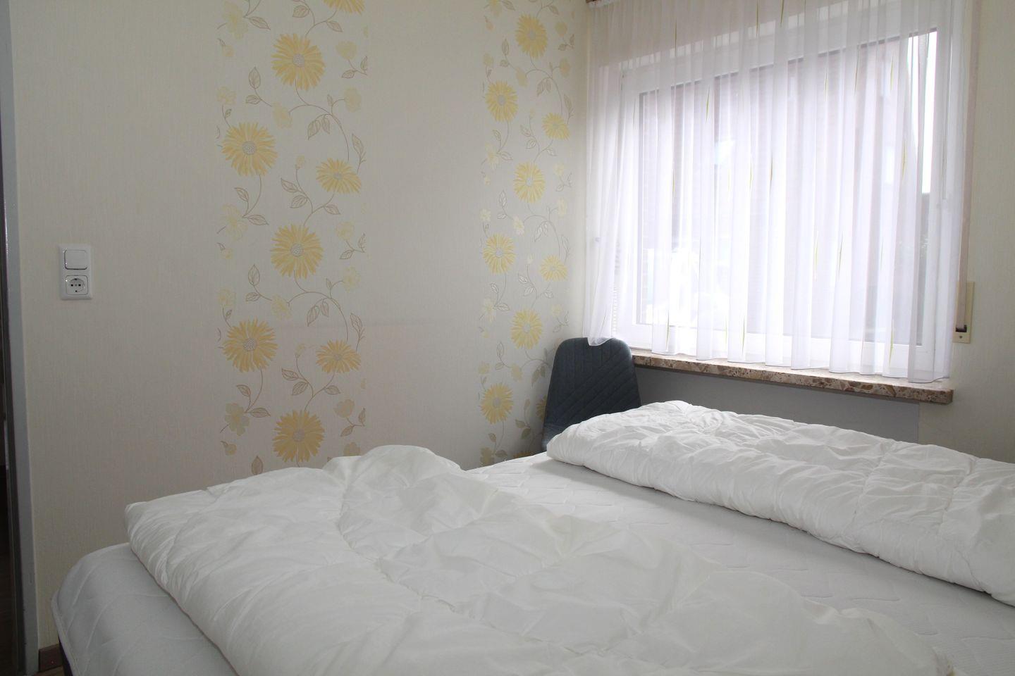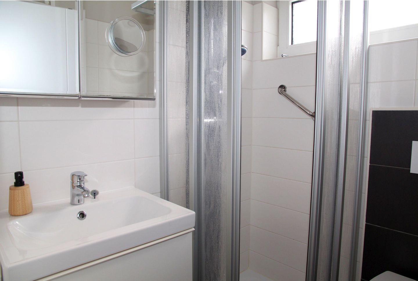 Das Schlafzimmer ist mit einem Doppelbett (durchgängige Matratze) und einem großen Kleiderschrank ausgestattet, im Badezimmer mit Fenster finden Sie eine Dusche mit niedrigem Einstieg, Waschbecken, WC und einen Handtuchheizkörper.