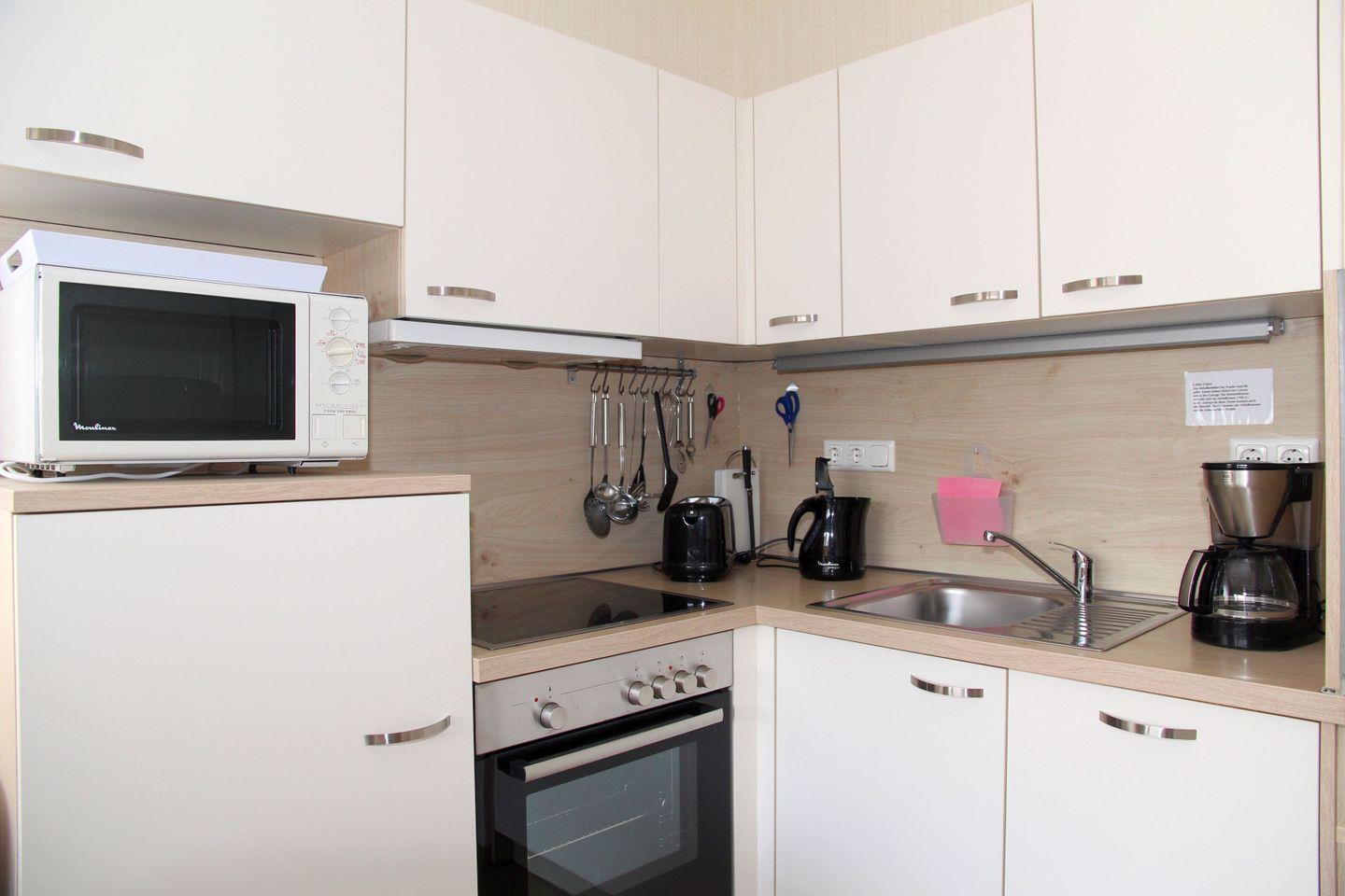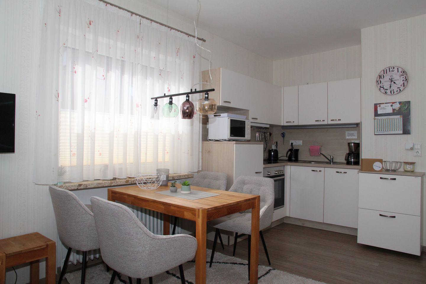 Im gemütlichen Wohnbereich finden Sie ein L-Sofa und einen Sessel mit gegenüberliegendem Fernseher. Ebenfalls befindet sich hier der Essbereich mit Esstisch und 4 Stühlen. Die Einbauküche verfügt über alle wichtigen Ausstattungsmerkmale für Ihren Urlaub: Kühlschrank mit Gefrierfach, Mikrowelle, Spülmaschine, Ceran-Herd, Backofen, Kaffeemaschine und Wasserkocher.