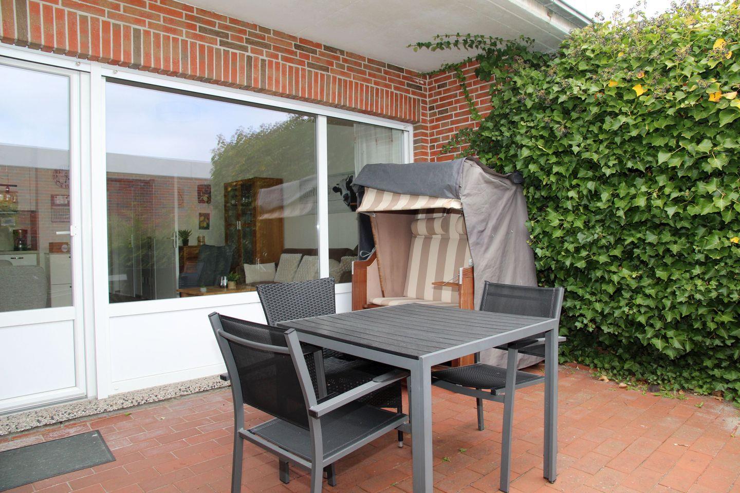 Die großzügige Terrasse ist mit Stühlen, Tisch und einem schönen Strandkorb bestückt. Dieser Bereich ist auch umzäunt.