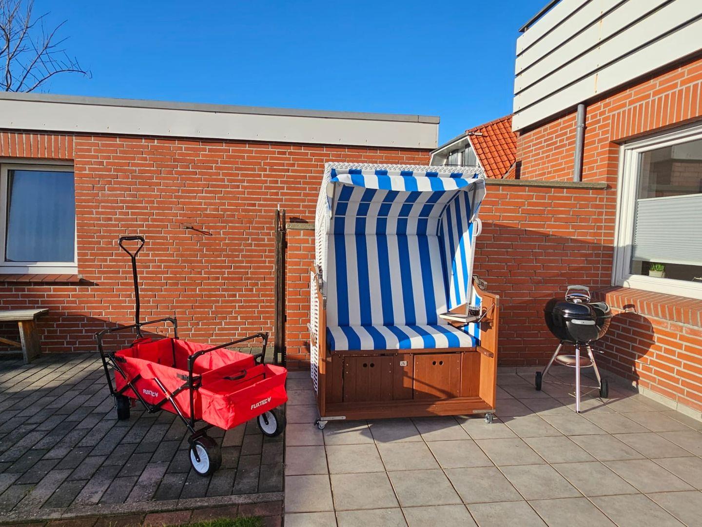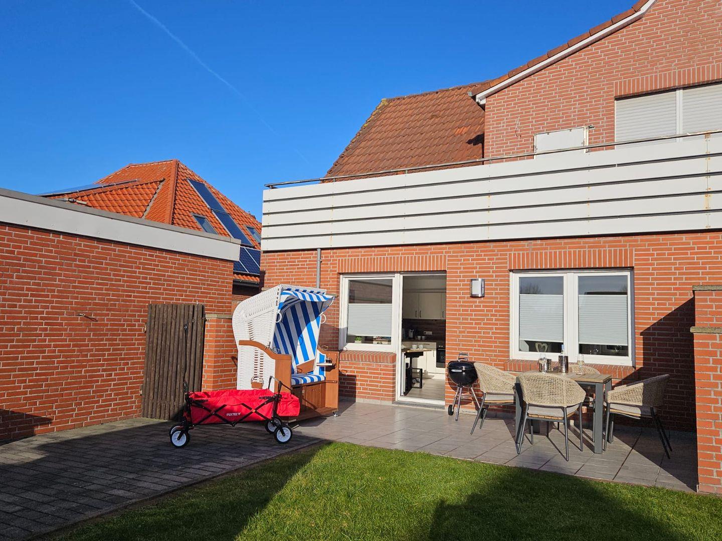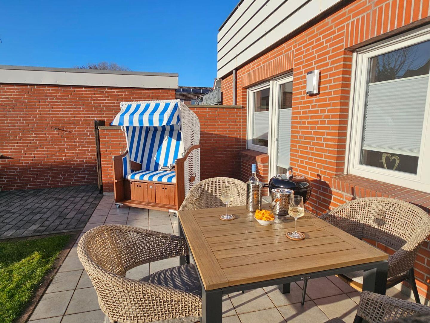 Private, sonnenverwöhnte Terrasse mit Gartenmöbeln, Sonnenschirm und ostfriesischem Strandkorb.