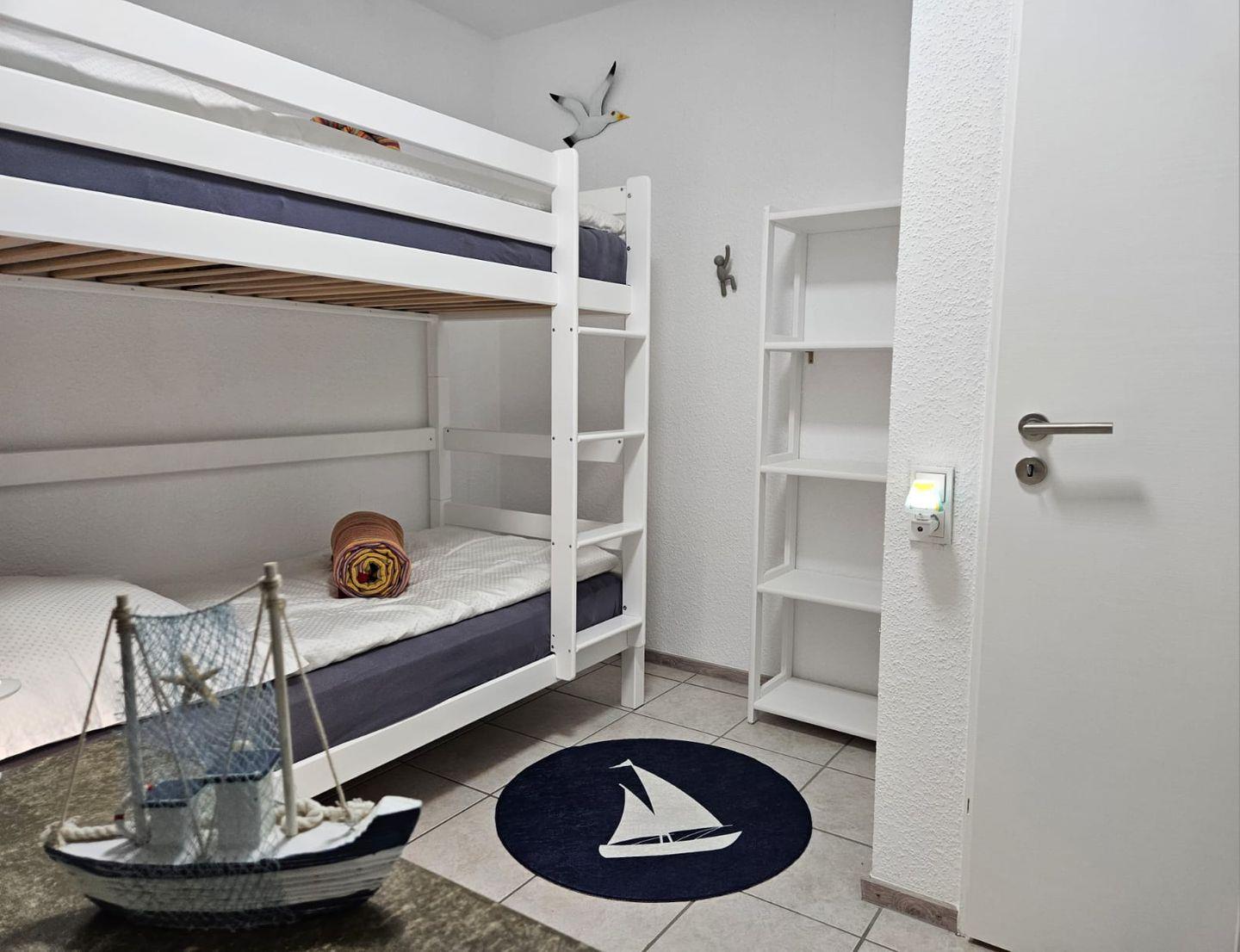 Kinderzimmer: Hochwertiges Stockbett (je 0,90?x?2,00?m) auch für Erwachsene geeignet (bis 140?kg je Bett). Deichschaf-Hocker „Oskar“ als Sitz- oder Fußhocker nutzbar (max. 120?kg).