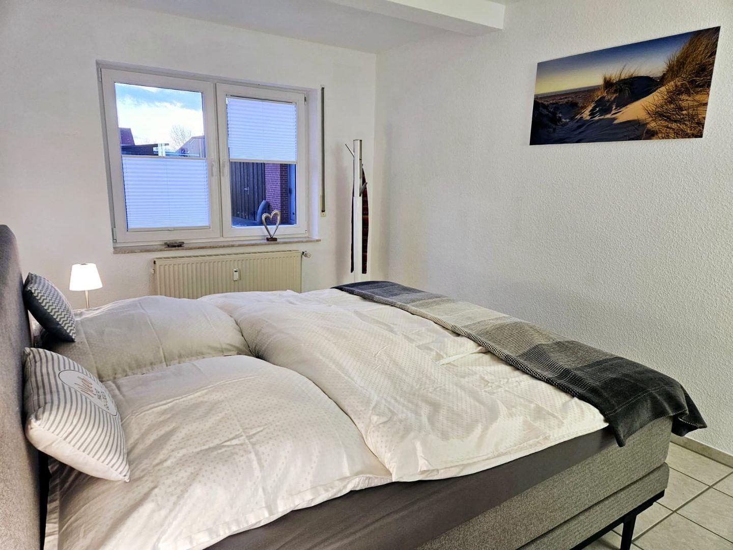 Schlafzimmer: Exklusives Boxspringbett (1,80?x?2,00?m) der Marke Swiss Sence für erholsamen Schlaf. Bettwäsche und Handtücher können gegen Aufpreis hinzugebucht werden.