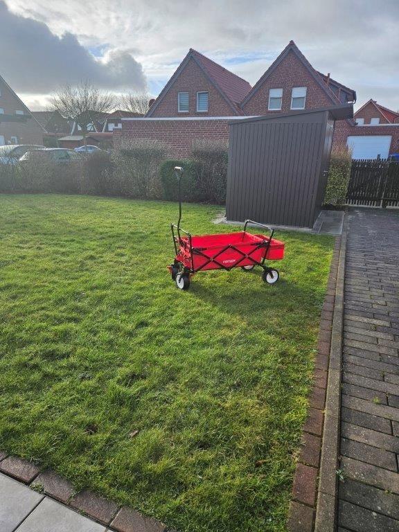 Abschließbarer Biohort/Gartenhaus mit Boller-Strandwagen, Holzkohle-Kugelgrill, Wäscheständer, Staubsauger und Platz für eigene Fahrräder.