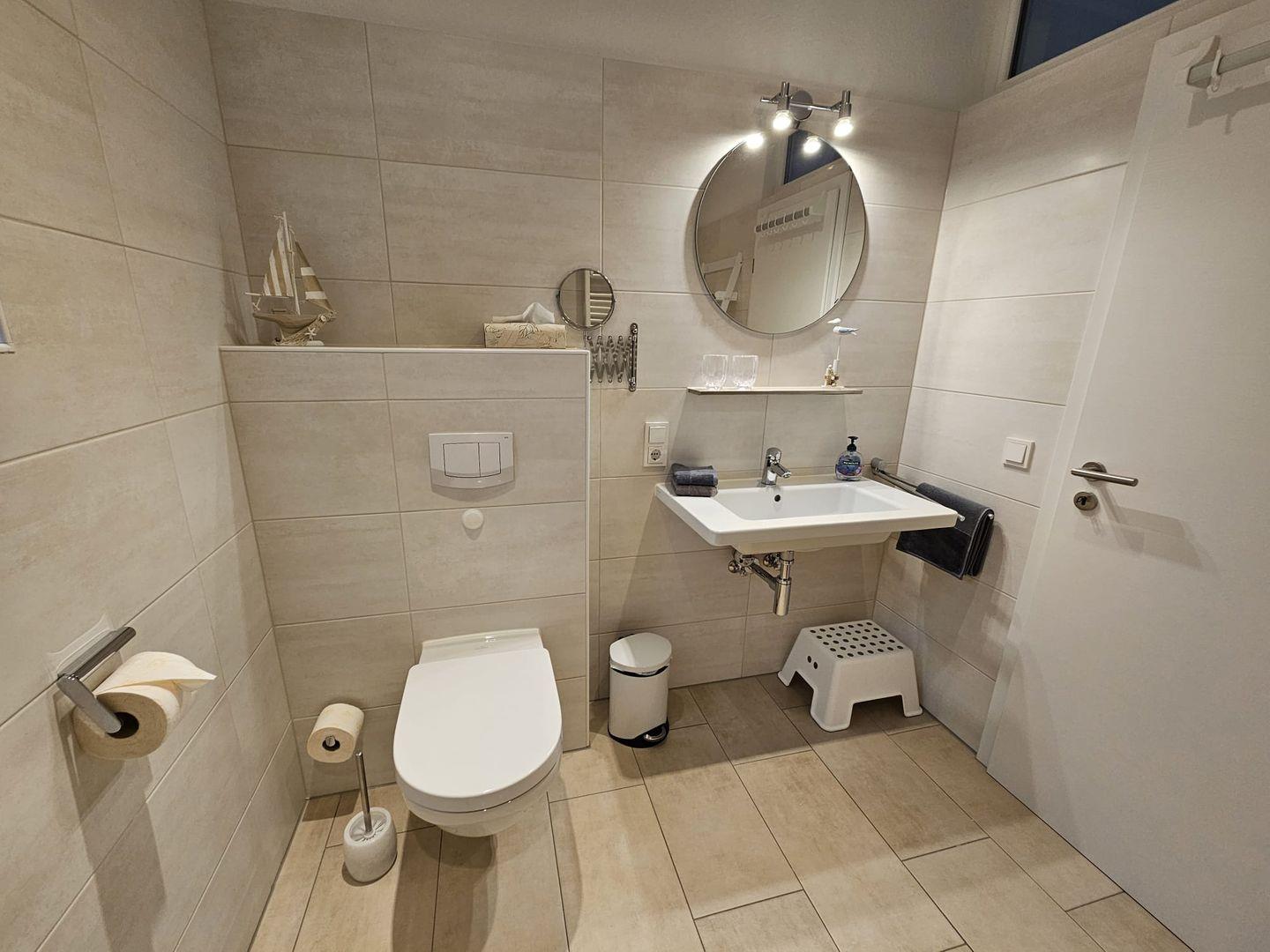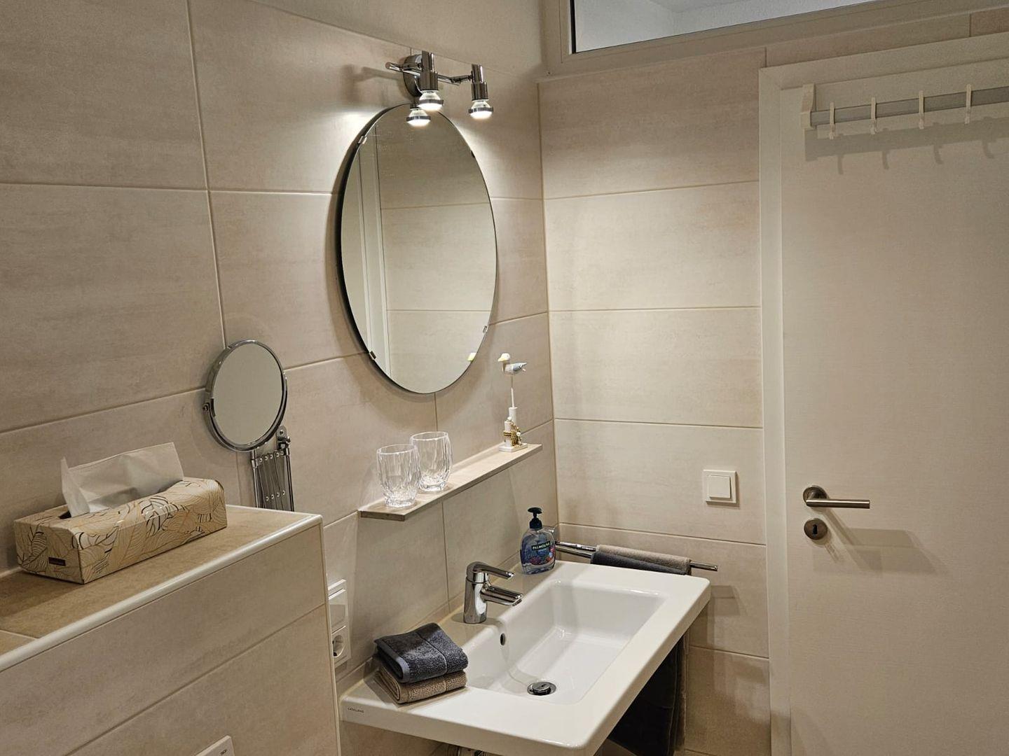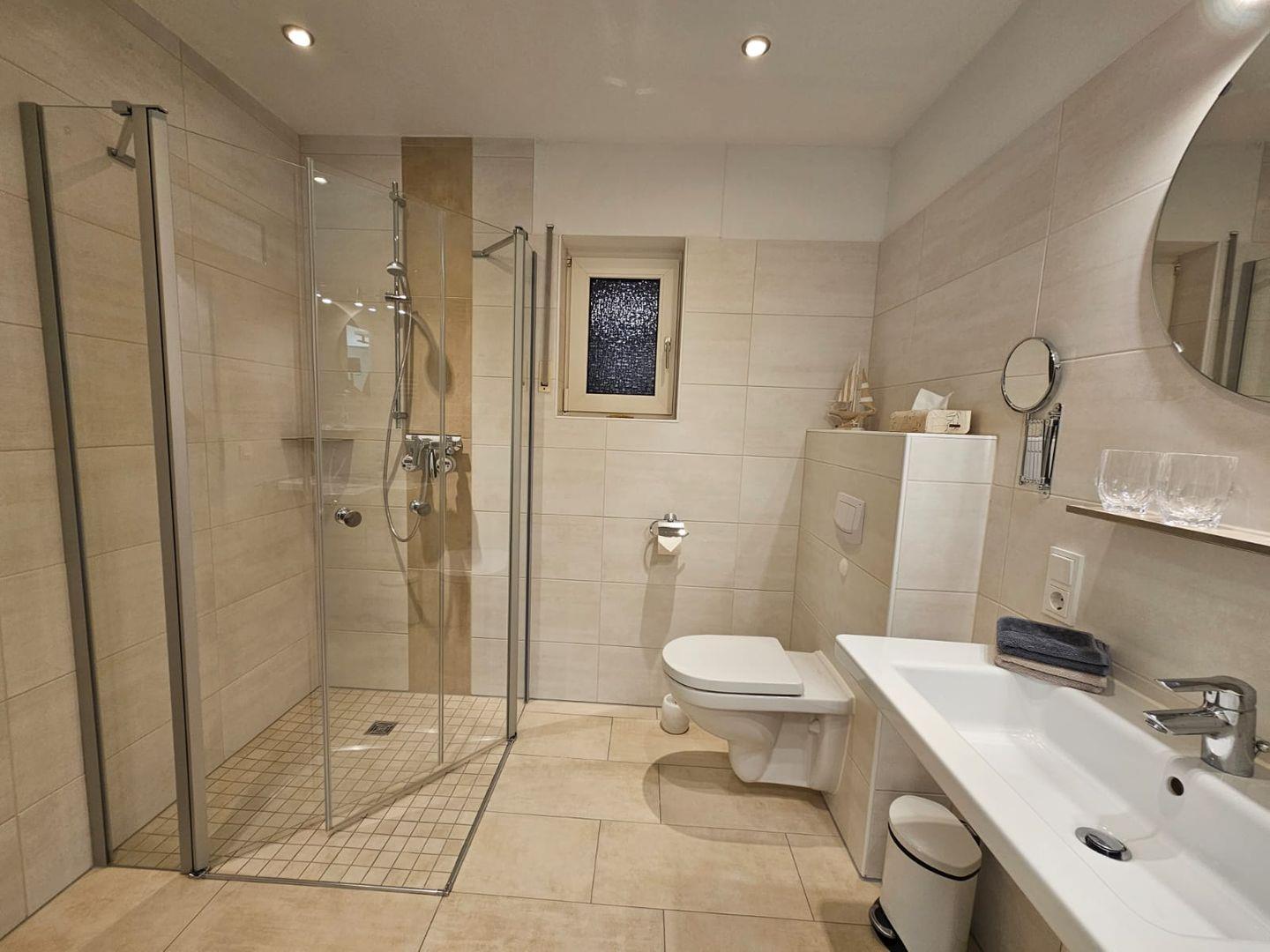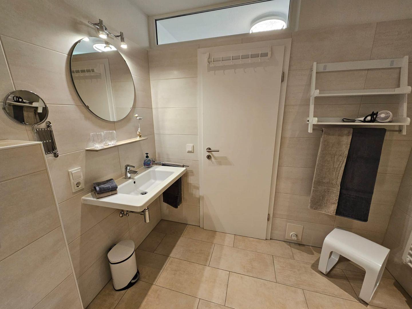Badezimmer: Tageslichtbad mit ebenerdiger Dusche, Handtuchheizung, Fußbodenheizung, Fön, Kosmetikspiegel und Spa-Duschhocker (max. 150?kg).