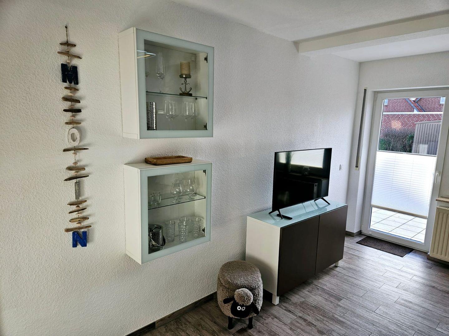 Wohnbereich: Helles Wohnzimmer mit komfortabler Ostfriesenbank und höhenverstellbarem Tisch für gemeinsame Mahlzeiten oder Spiele. Entspannen Sie bei Smart-TV, Radio DAB+ oder genießen Sie die Zeit auf der Terrasse. Kinderhochstuhl vorhanden.