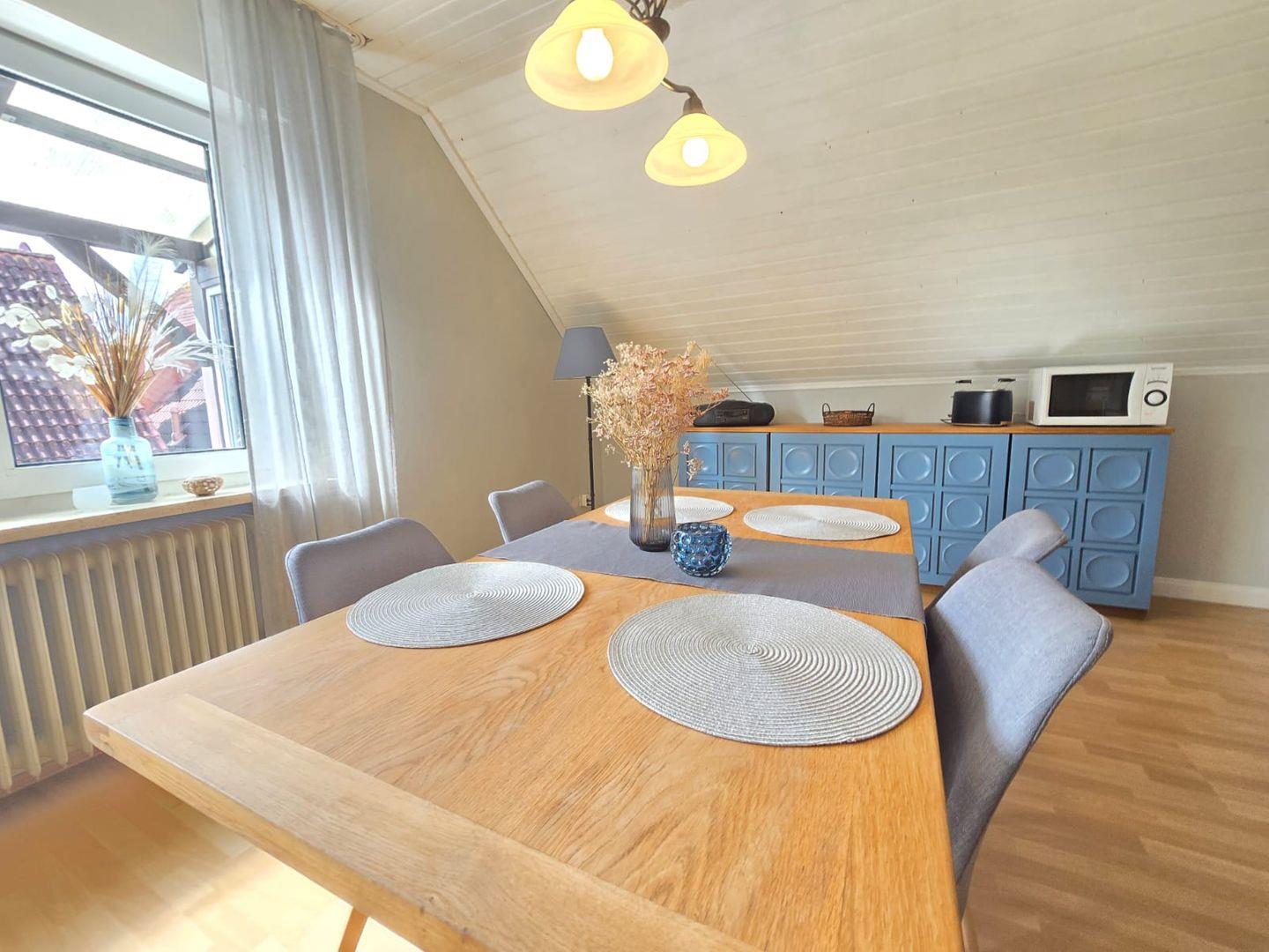 Der große Wohn- und Essbereich bietet ausreichend Platz zum Entspannen, Spielen oder gemeinsamen Kochen. Zwei komfortable petrolfarbene Sessel laden zum Relaxen ein, während der Essbereich zu geselligen Mahlzeiten einlädt. Bettwäsche und Handtücher können gegen Aufpreis hinzugebucht werden.