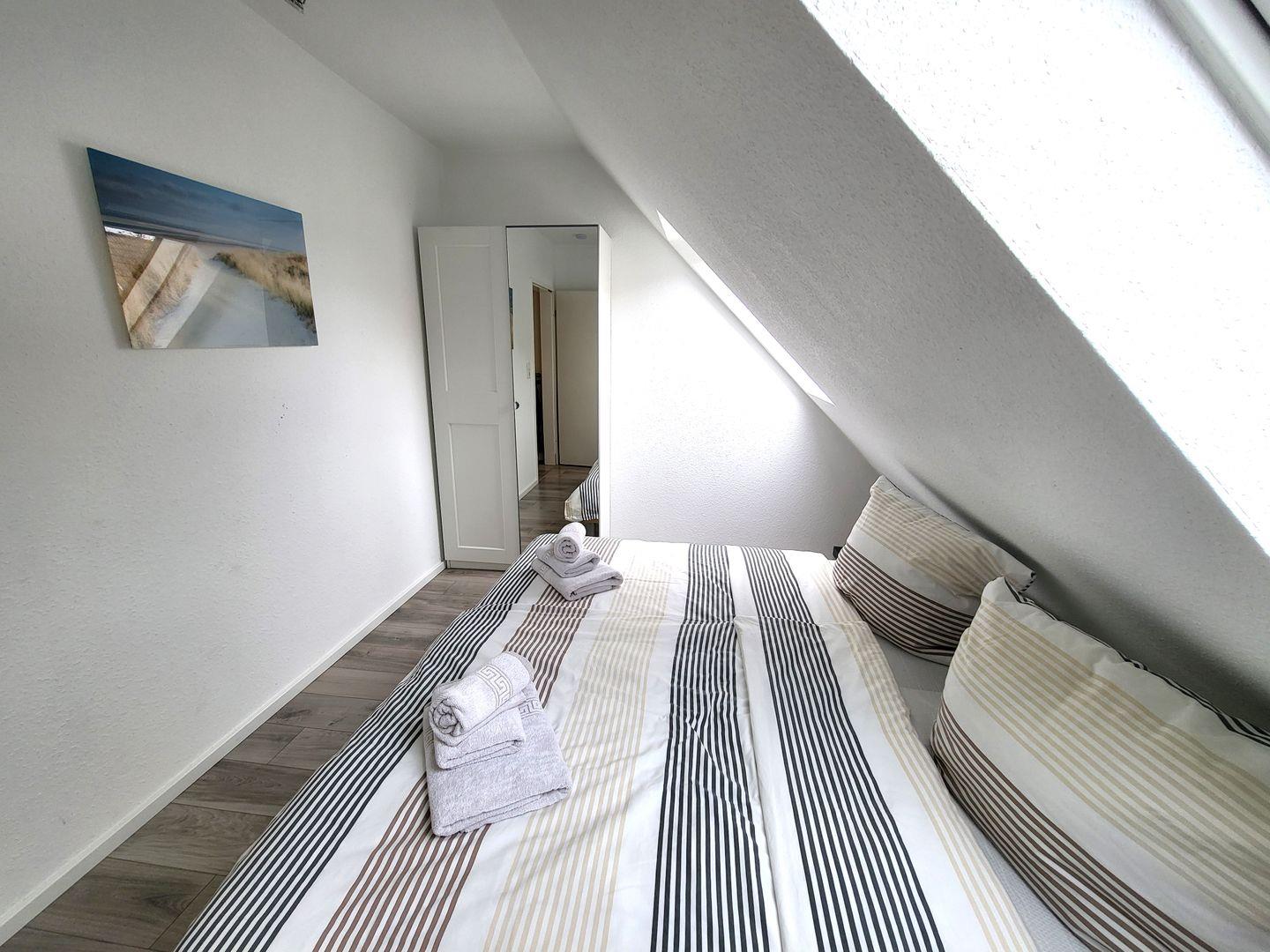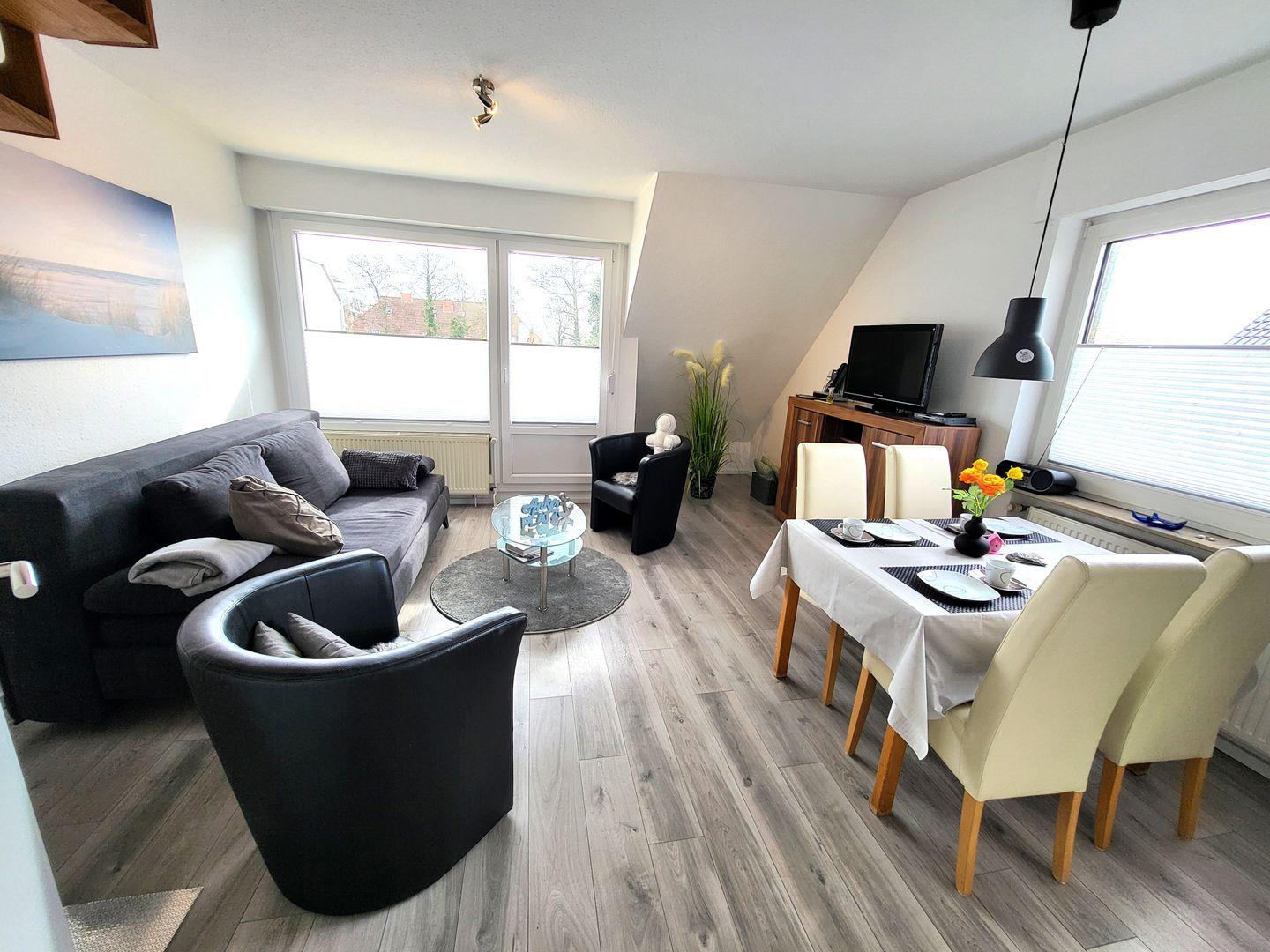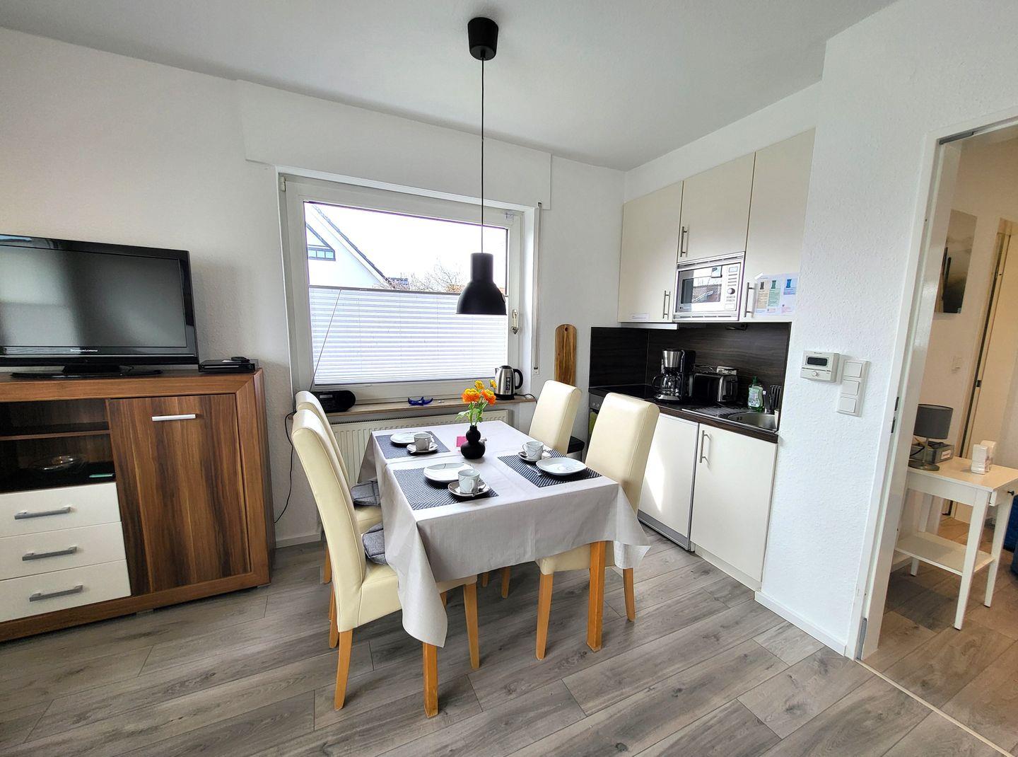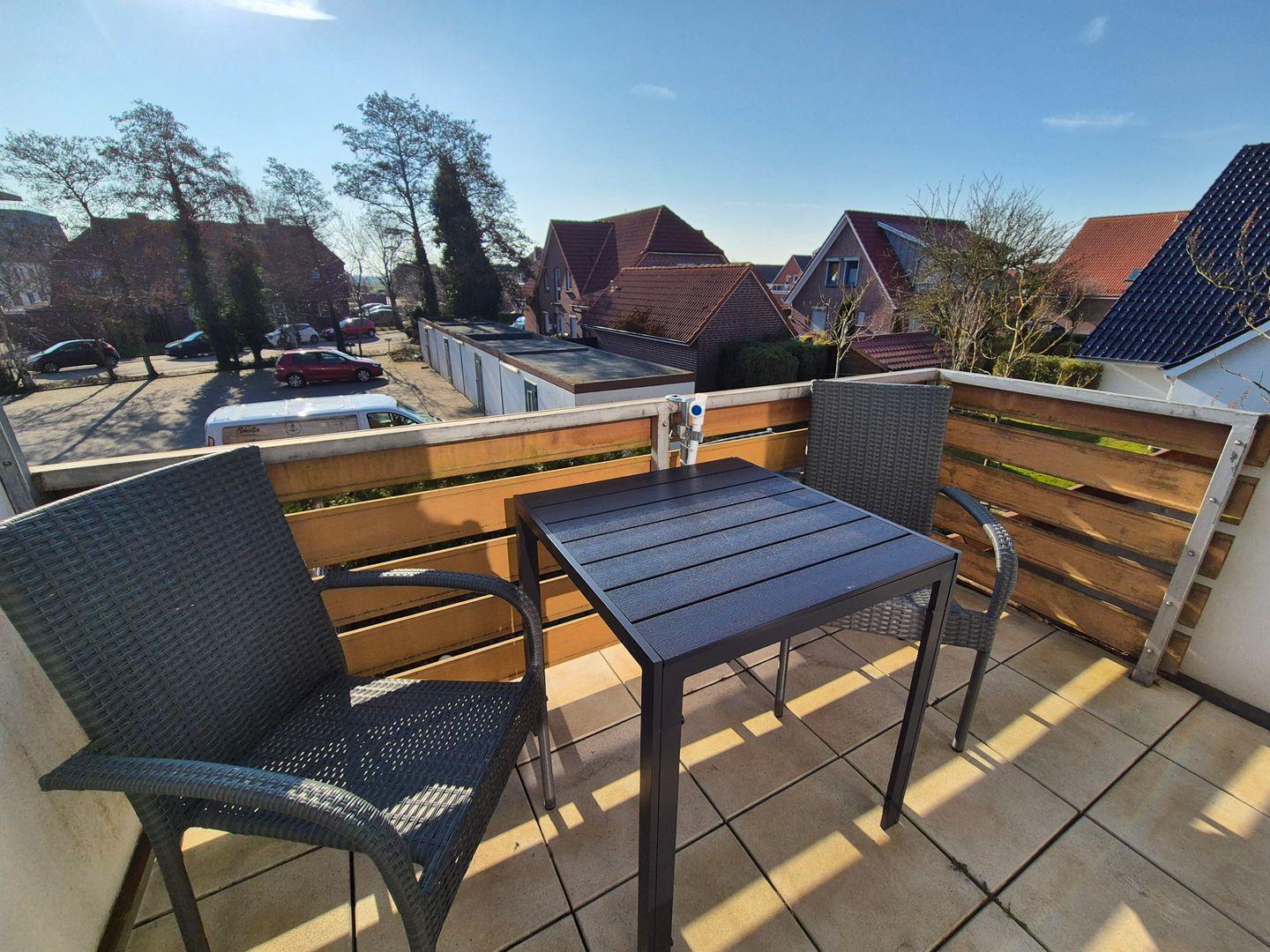 Diese Obergeschoß Ferienwohnung verfügt über eine voll ausgestattete Küchenzeile mit einer Mikrowelle, ein Kühlschrank, ein Backofen/Ceranfeld, ein Wasserkocher und eine Kaffeemaschine, ein Wohnzimmer mit einem Sofa mit Schlaffunktion (Ideal für eine 3te Person) und einen Flachbild-TV und ein wunderschönes eigenes Bad. Diese geschmackvolle Eingerichtete Unterkunft verfügt über einen Balkon mit Gartenmöbel und einen Gemeinschaftsraum für Fahrräder. Genießen Sie Ihr Frühstück an der frischen Seeluft.