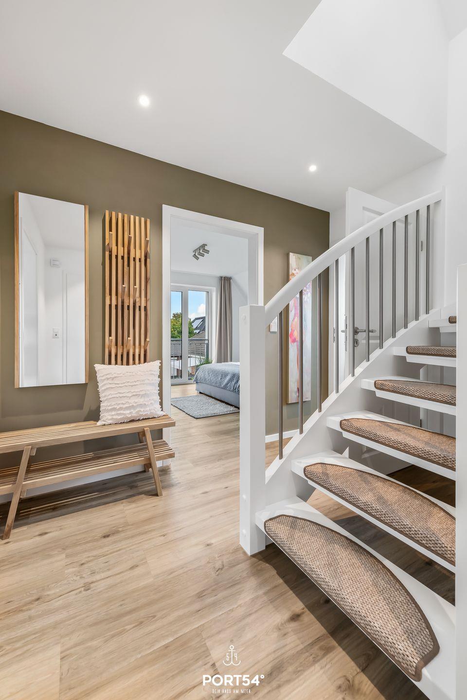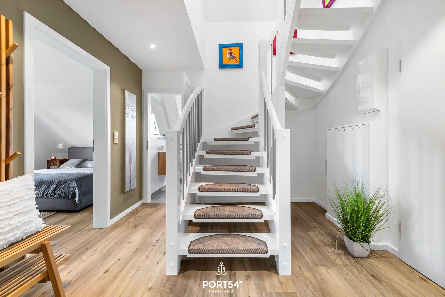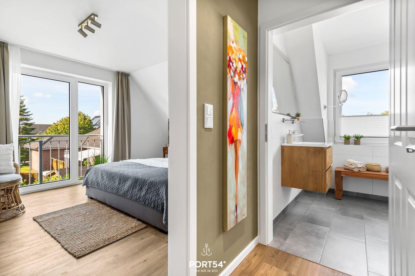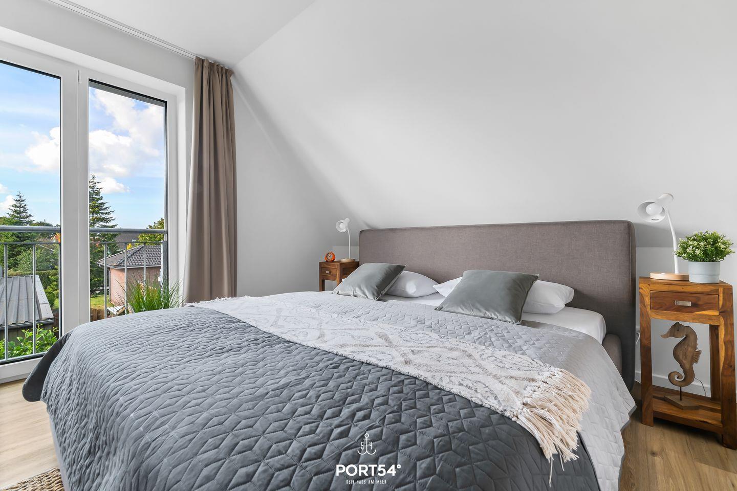 Die im OG gelegene Neubau-Ferienwohnung "Westwind" über 2 Etagen, mit Balkon ist für 6 Personen geeignet. Der Wohnbereich ist mit einem Schlafsofa und TV ausgestattet. Die voll ausgestattete Küche ist offen zum Wohnzimmer. Bodentiefe Fenster sorgen für viel Tageslicht. Es gibt 2 Schlafzimmer: je 1 Bett (180x200cm) mit Verdunkelungsmöglichkeiten. 1 Badezimmer mit einer ebenerdigen Dusche und ein extra Gäste-WC im OG sind vorhanden.