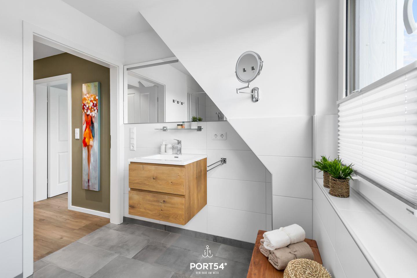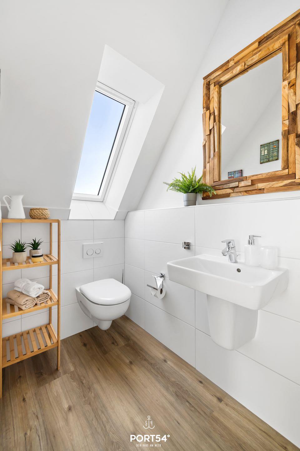 Im Dachgeschoss befindet sich außerdem ein Gäste Bad mit WC, Waschmaschine und Waschbecken. Dort gibt es auch einen komfortablen Abstellraum für Ihr Gepäck. Das helle Badezimmer im 1. OG ist mit einer ebenerdigen Dusche, einem WC, einem Kosmetikspiegel sowie einem Waschbecken ausgestattet.