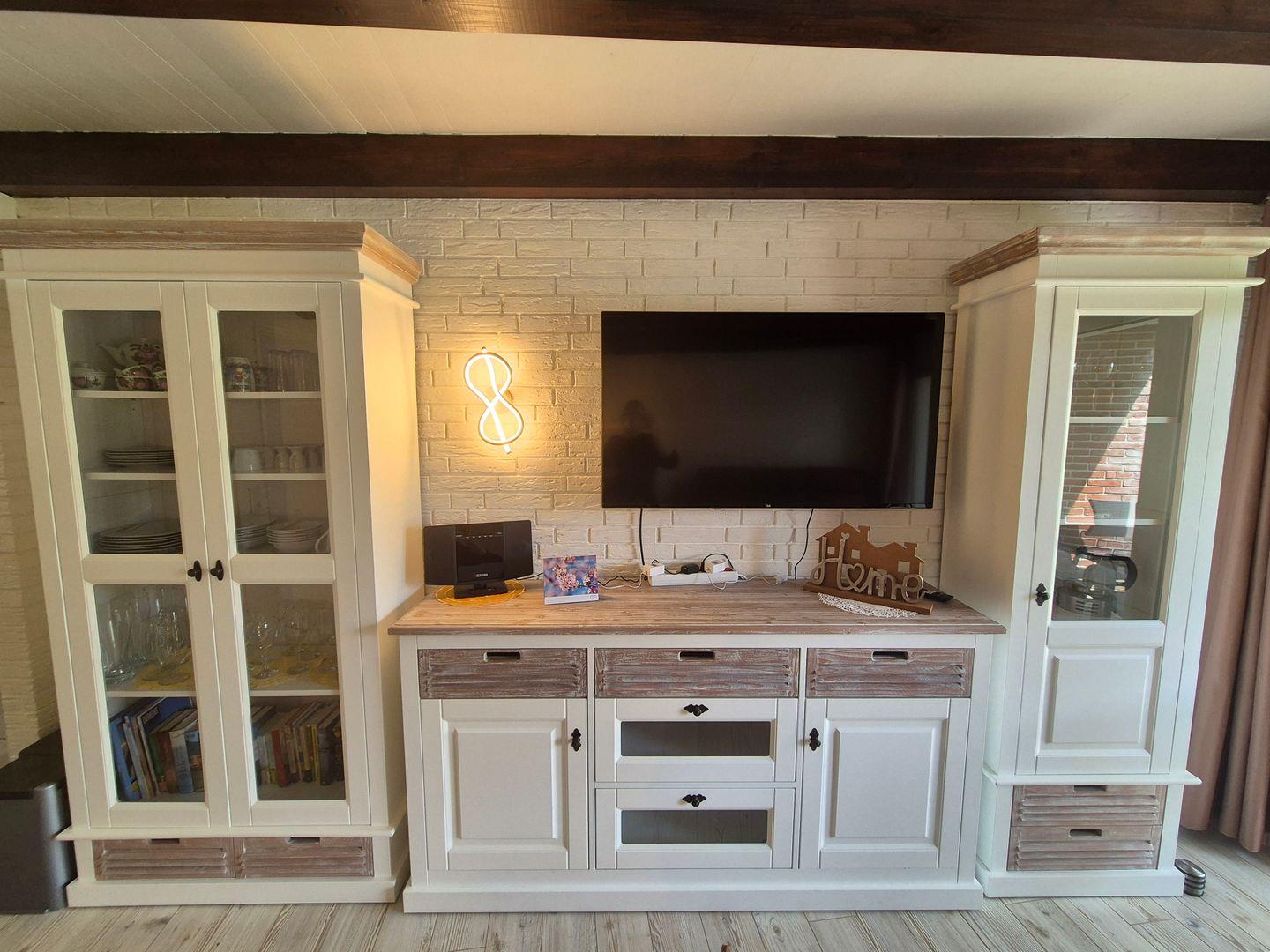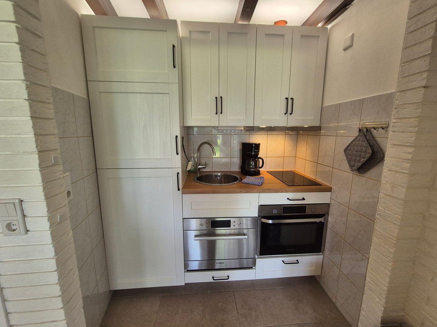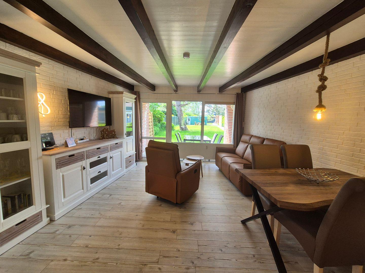 Wohn- Esszimmer mit TV-Flachbildschirm, Radio mit CD/MP3-Player USB Blutetooth, Couch und Esstisch. Offene moderne Küche mit 2-Platten Induktionskochfeld, Kombigerät Backoffen/Mikrowelle, Kühlschrank mit Gefrierfach, Kaffeemaschine, Wasserkocher, Toaster und Geschirrspüler.