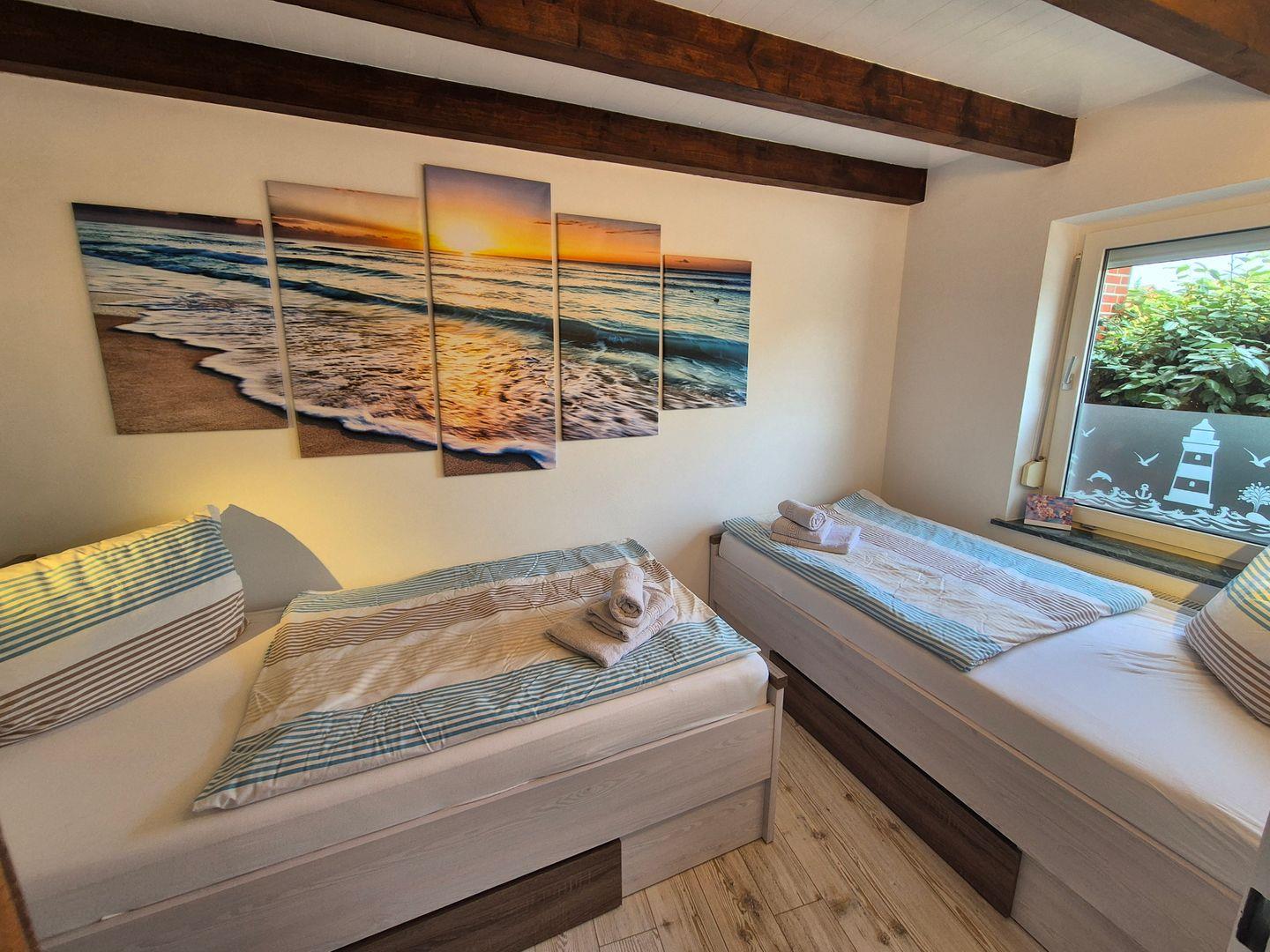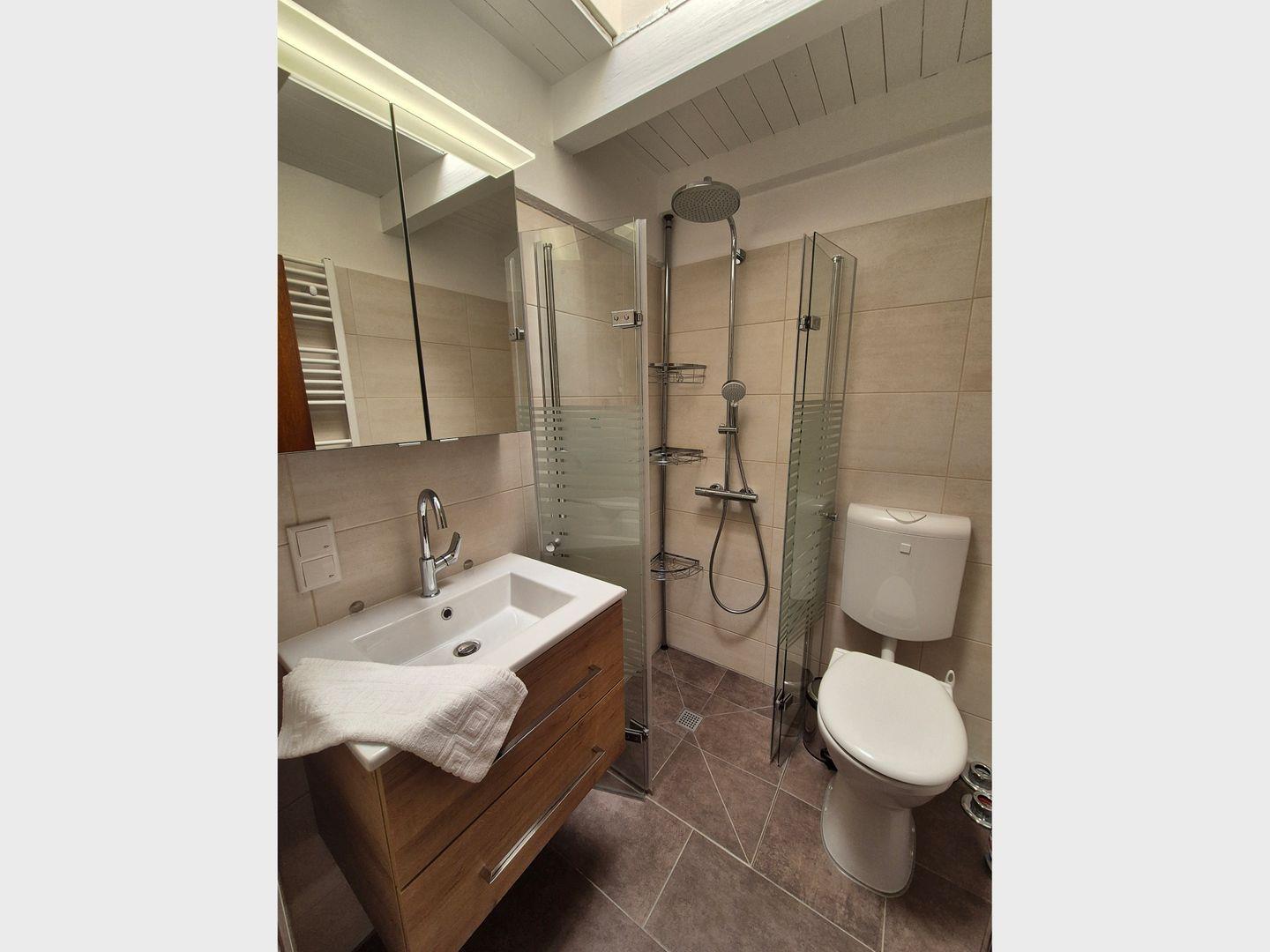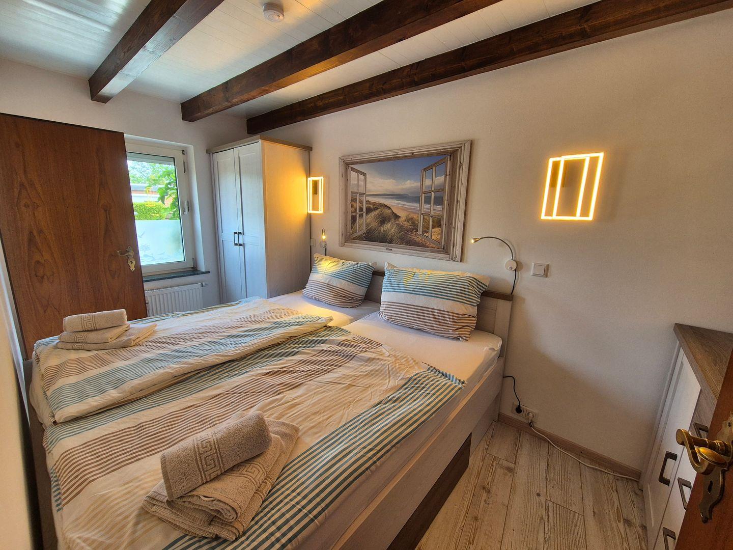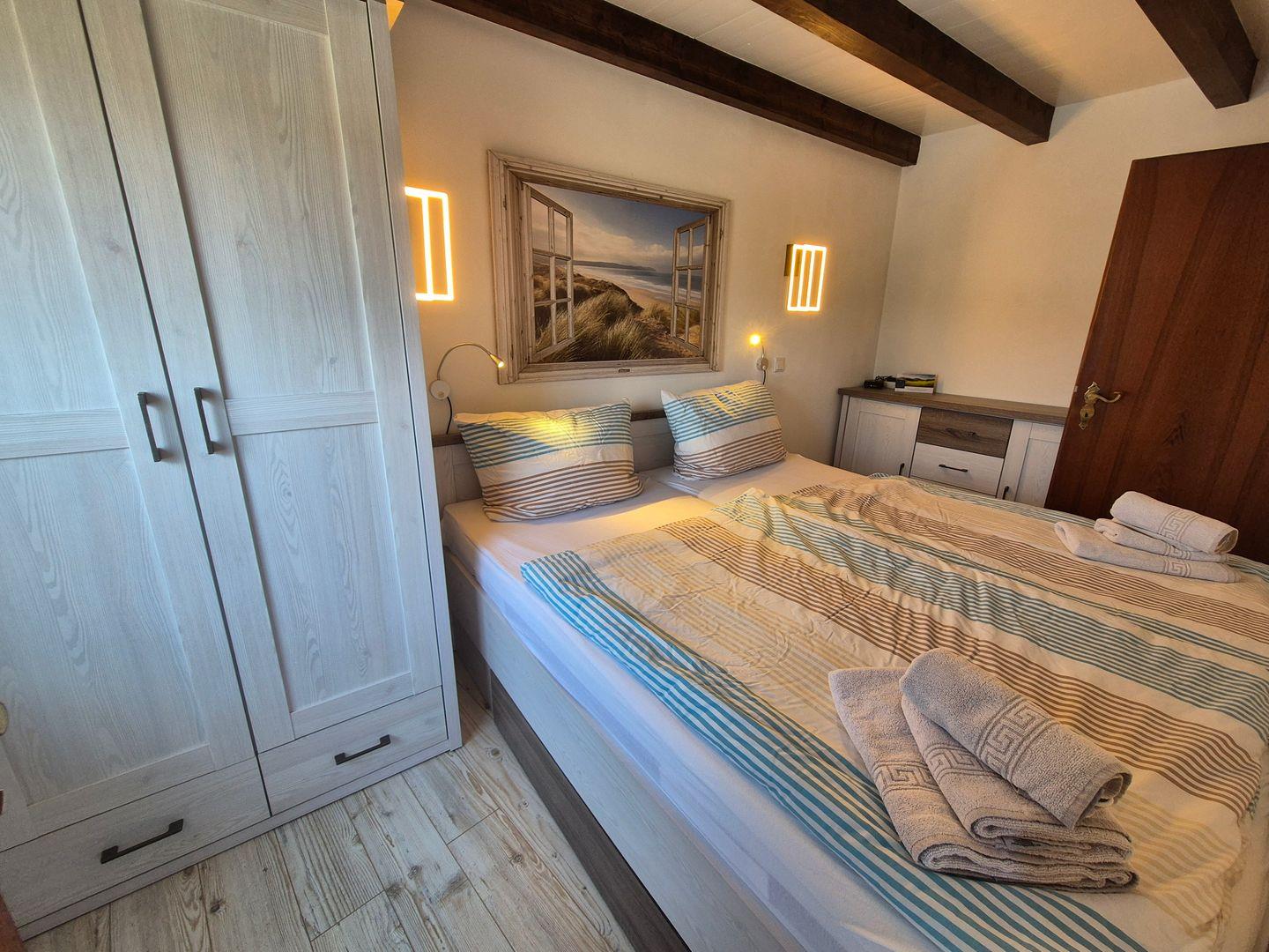 Es erwartet Sie 1 Schlafzimmer mit Doppelbett (180×200 cm) und 1 Schlafzimmer mit 2 Einzelbetten (100x200). Das moderne Badezimmer verfügt über eine Dusche sowie ein WC.