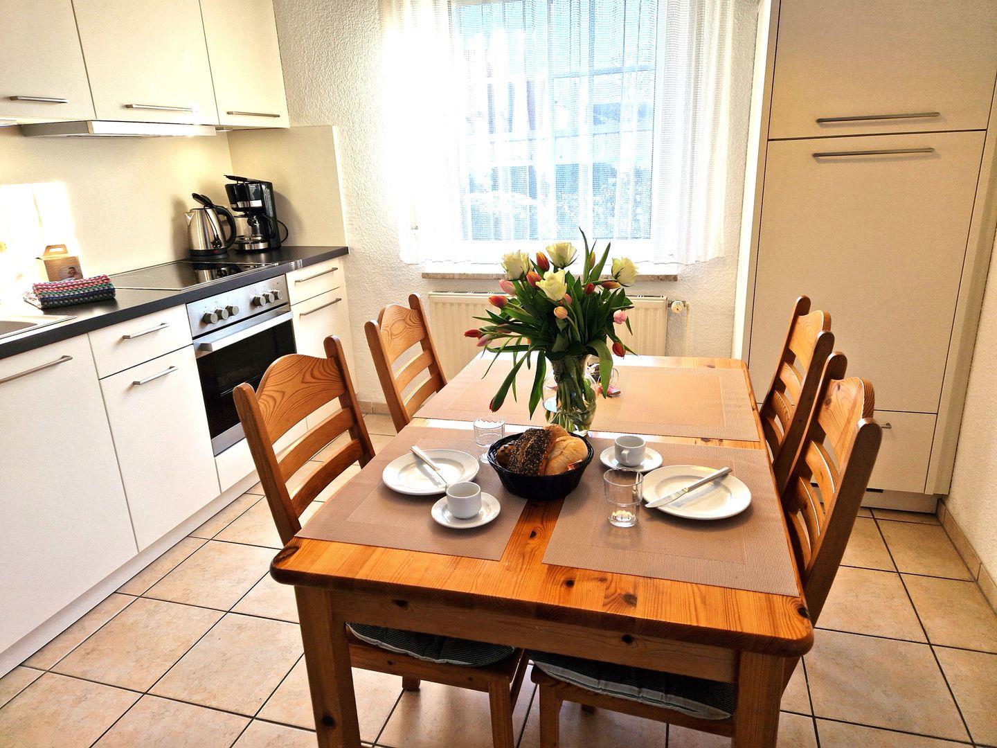Ausgestattet ist die Küche mit einem Ceranfeld, Backofen und Kühlschrank mit Gefrierfach.