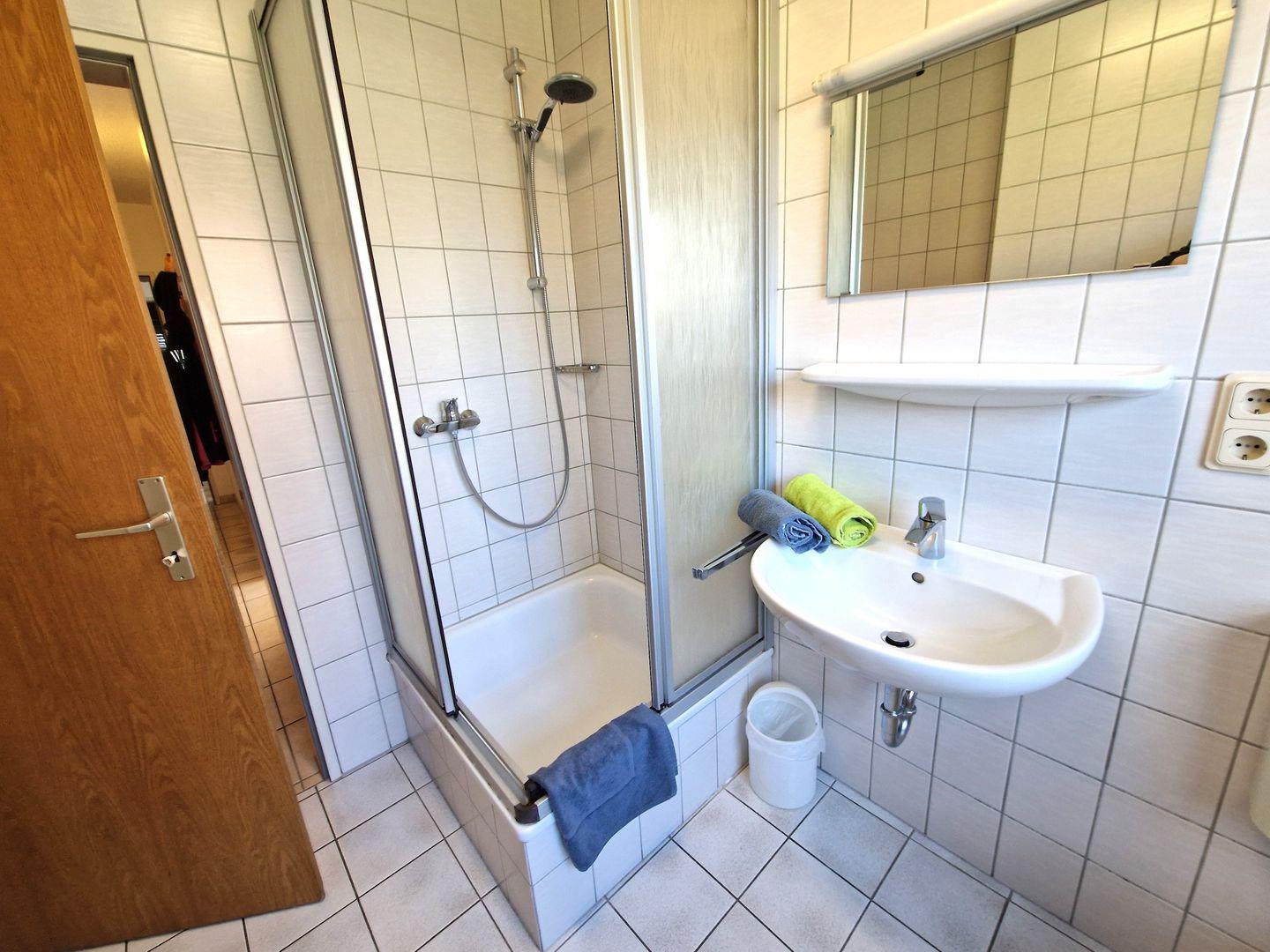 Das Bad ist mit Dusche und Fenster ausgestattet.