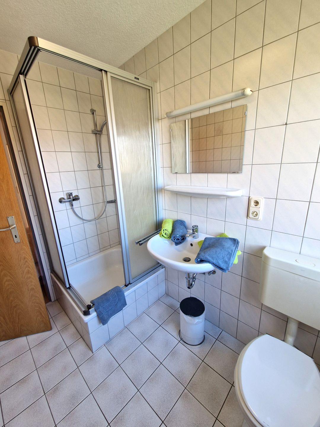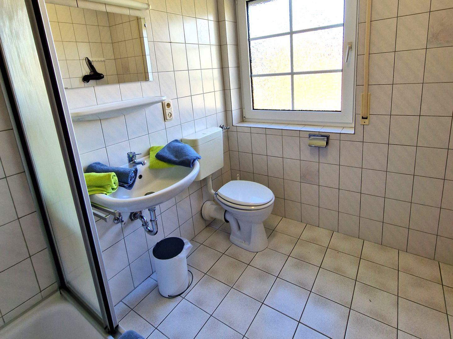 Das Bad ist mit Dusche und Fenster ausgestattet.