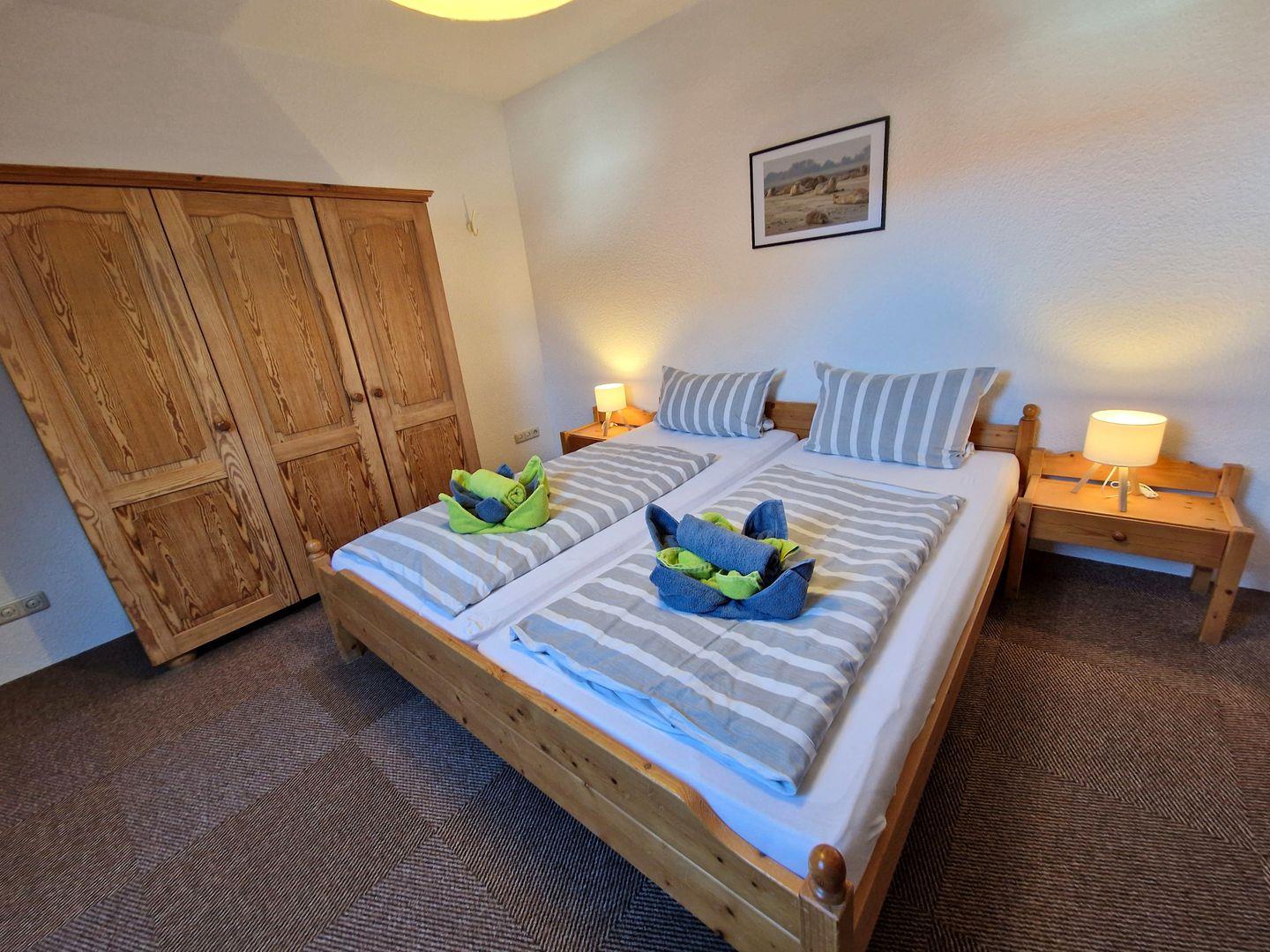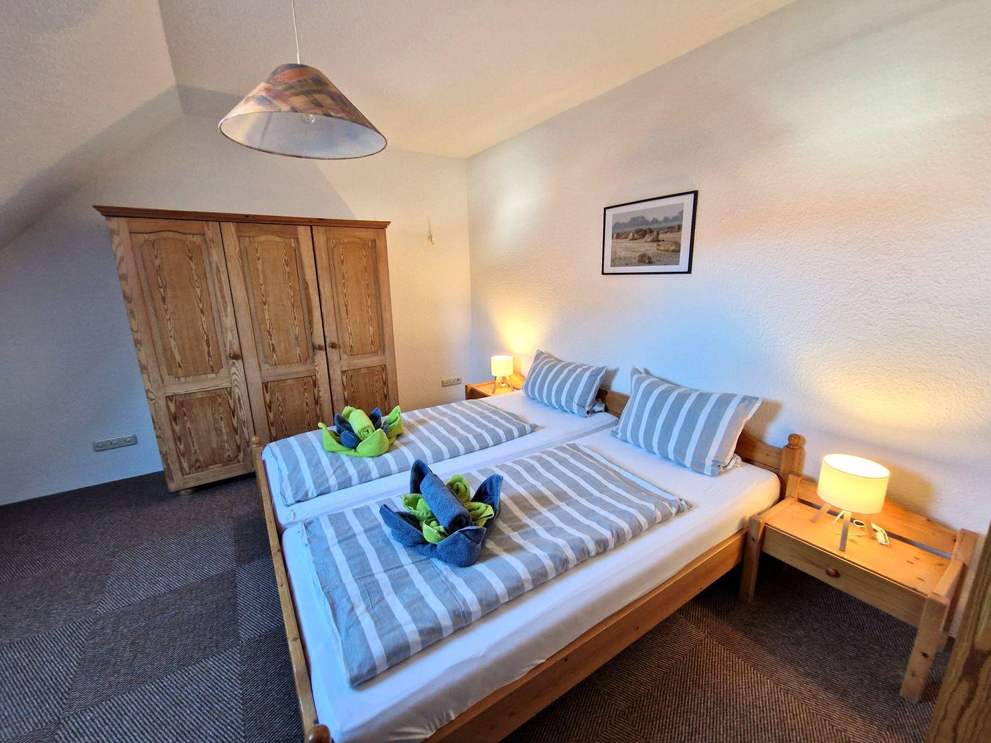 Hier befindet sich das Schlafzimmer mit einem Doppelbett sowie das Bad.