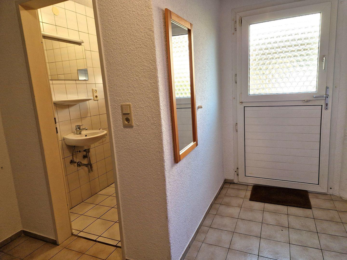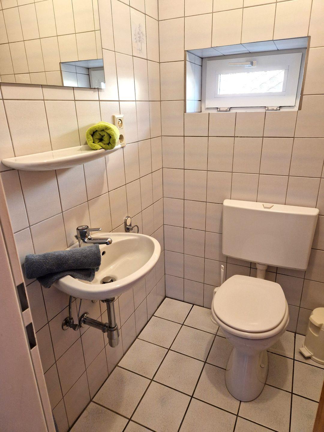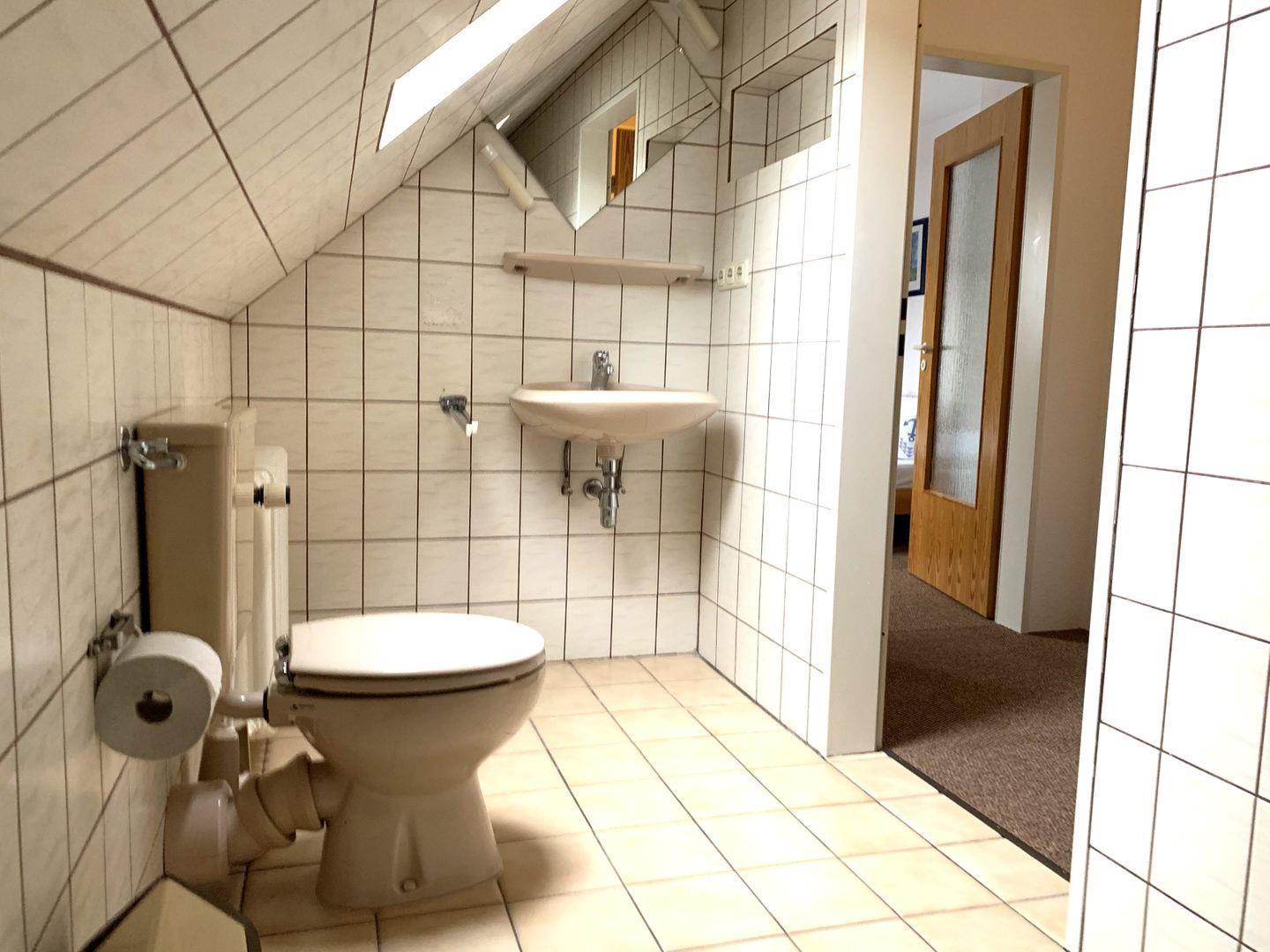 Das Bad ist mit Dusche und Fenster ausgestattet. Allerdings sind zur Dusche Stufen vorhanden.
