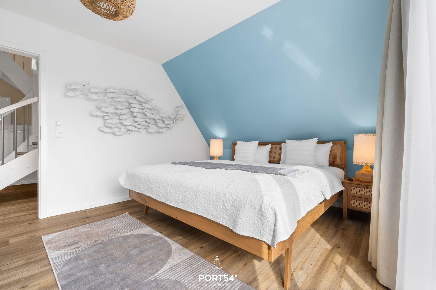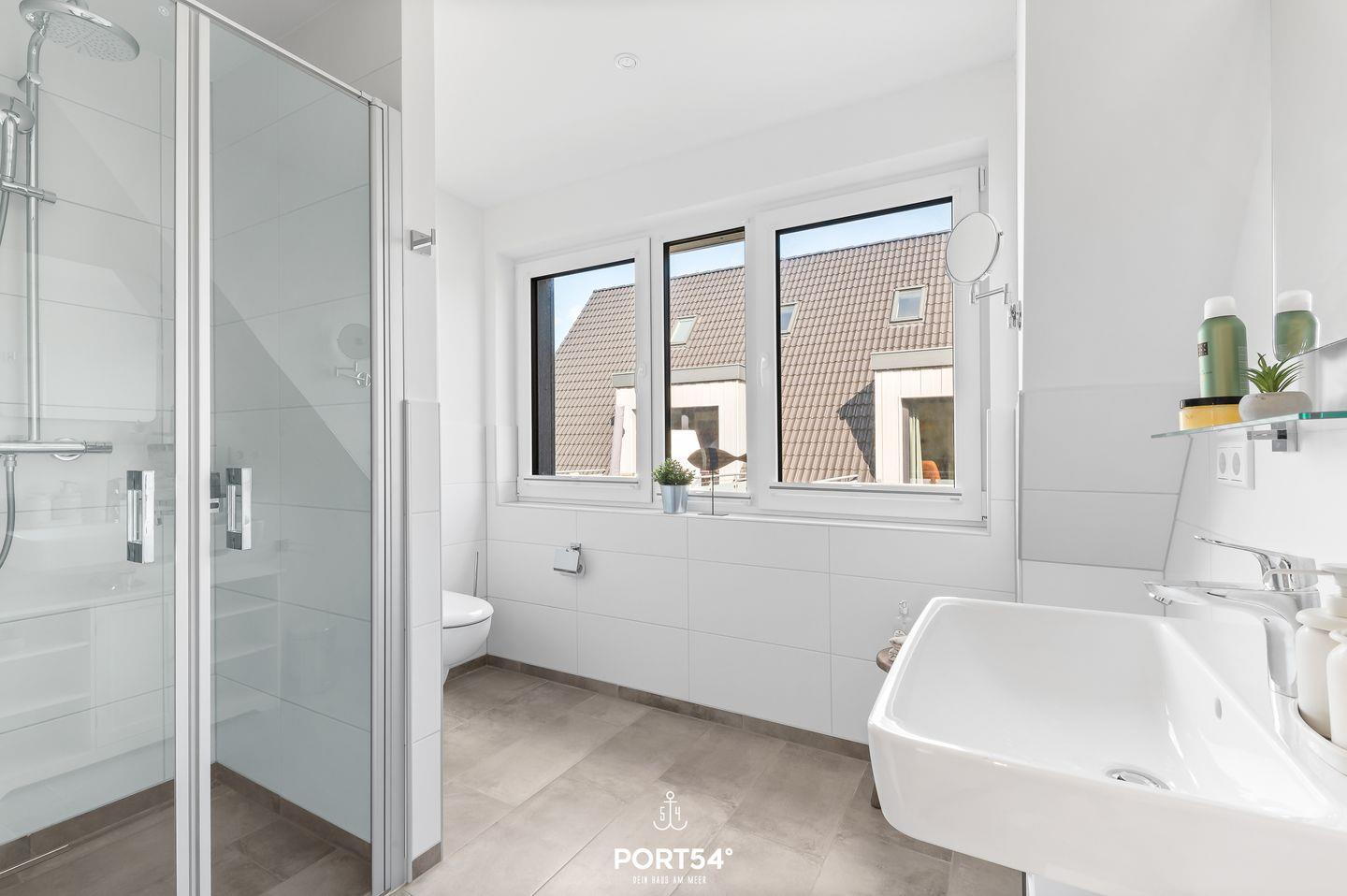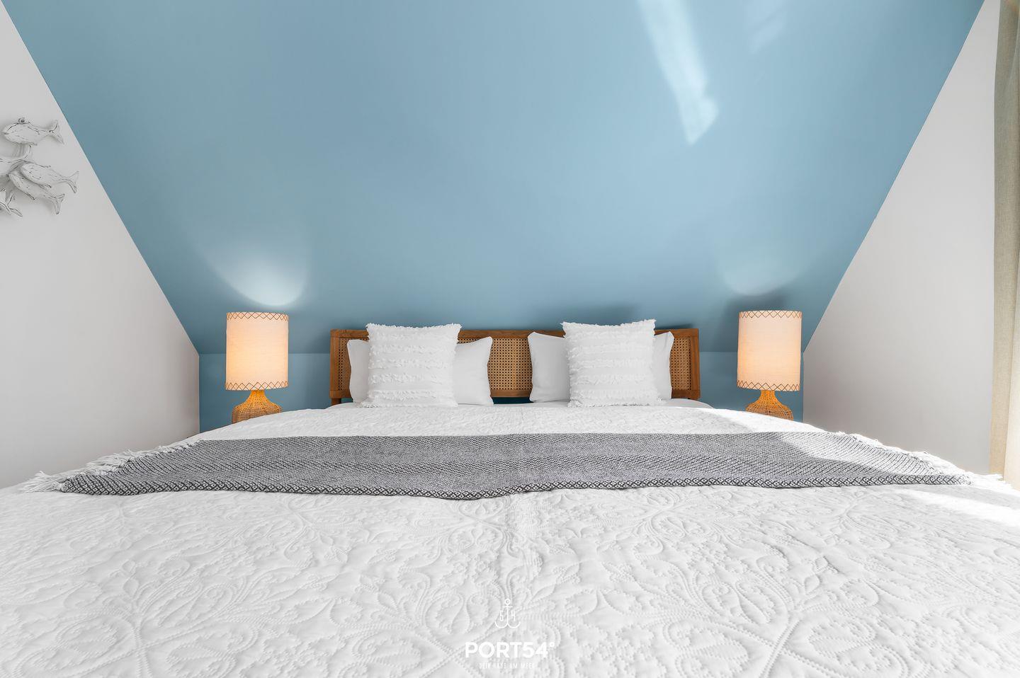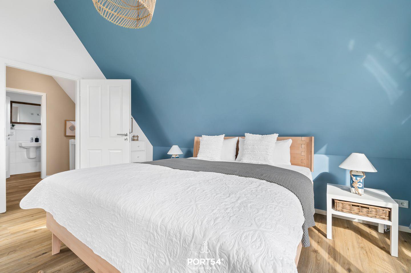 Beide Schlafzimmer verfügen über ein Doppelbett (180x200 cm), sowie Verdunkelungsmöglichkeiten, eines der Schlafzimmer ist zusätzlich mit einem Smart-TV ausgestattet. Das Tageslicht-Duschbad punktet einer ebenerdigen Dusche, einem WC sowie einem Waschbecken.