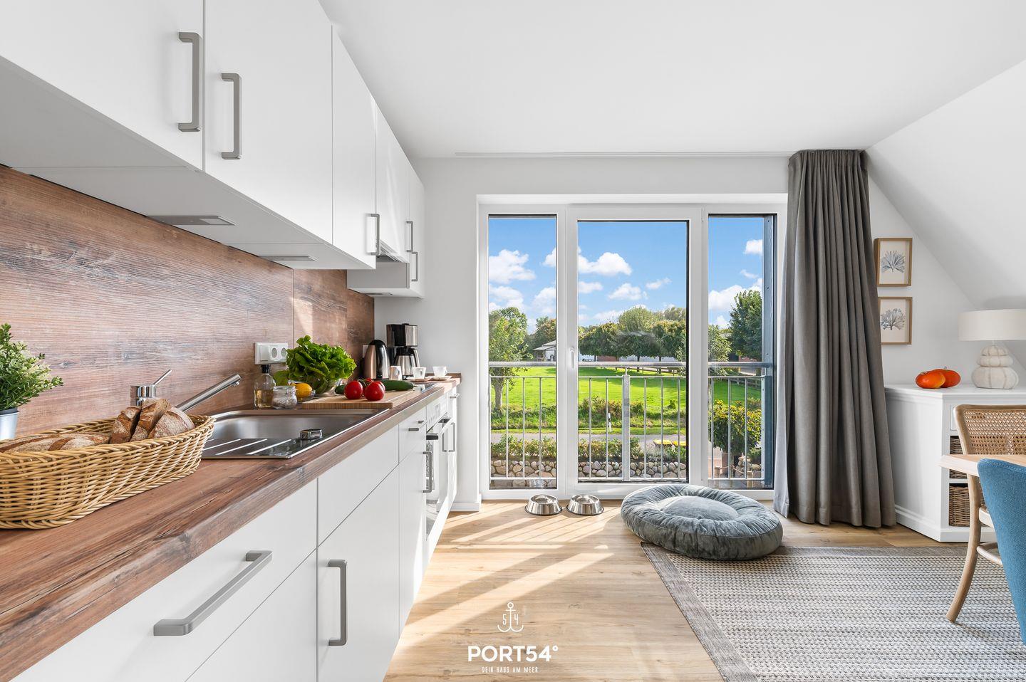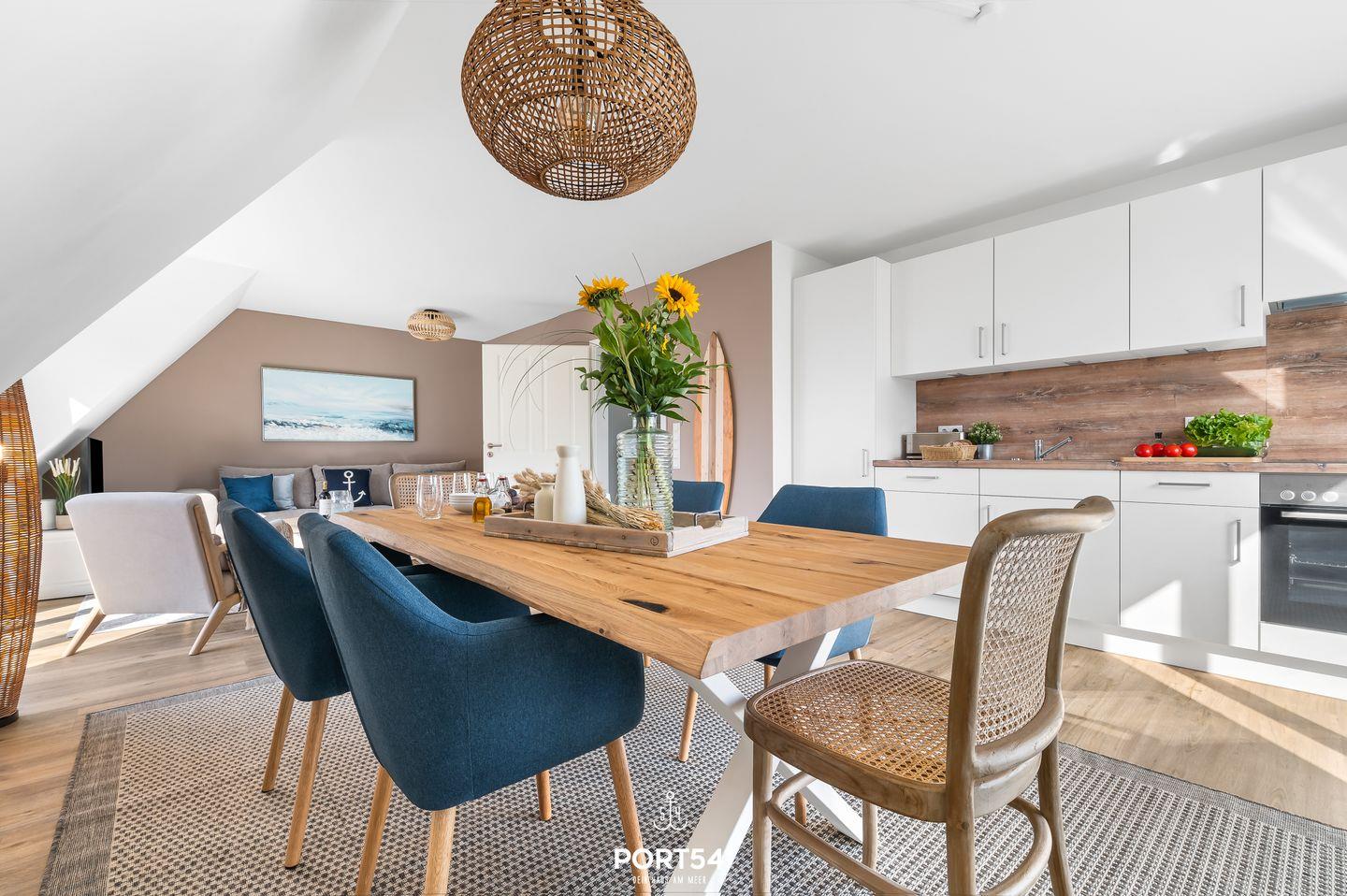 Der helle und freundliche Wohnbereich ist mit einer gemütlichen Wohnlandschaft inklusive Schlaffunktion (250x160cm) und einem Flachbild-TV ausgestattet. Die angrenzende offene moderne Küche bietet alle Annehmlichkeiten, die für einen geselligen Kochabend benötigt werden. Am Esstisch mit bequemen Stühlen können Sie gemeinsam essen oder einen Spieleabend verbringen. Von hier aus gelangen Sie auf den vollmöblierten Balkon.