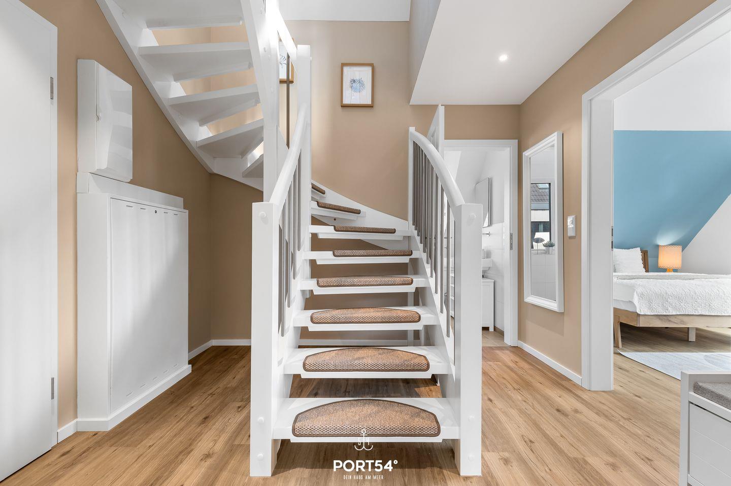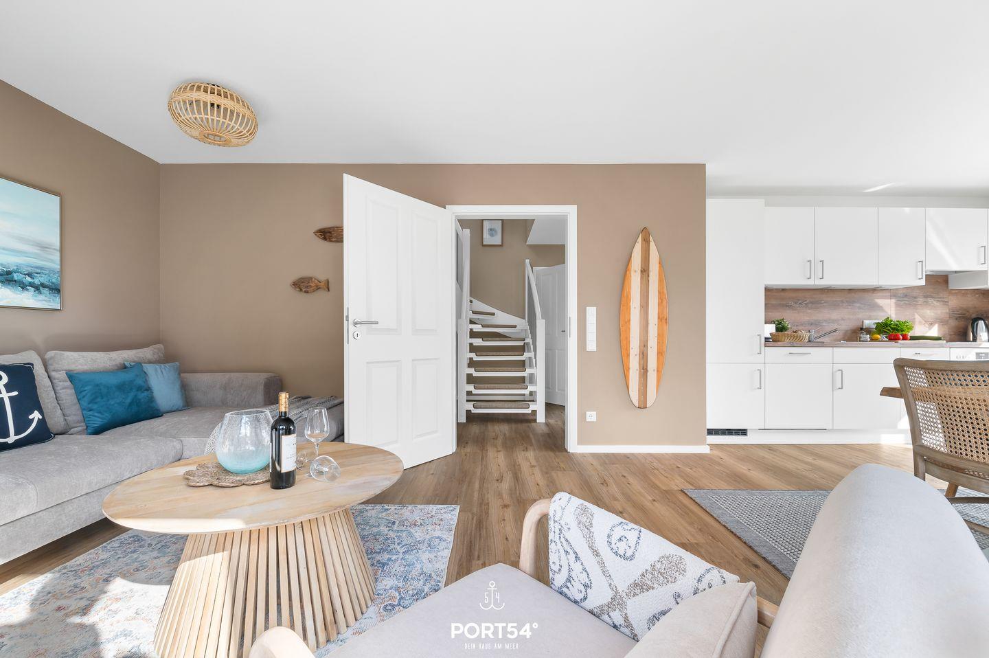 Die im OG gelegene Neubau-Ferienwohnung "Westwind" über 2 Etagen, mit Balkon ist für 6 Personen geeignet. Der Wohnbereich ist mit einem Schlafsofa und TV ausgestattet. Die voll ausgestattete Küche ist offen zum Wohnzimmer. Bodentiefe Fenster sorgen für viel Tageslicht. Es gibt 2 Schlafzimmer: je 1 Bett (180x200cm) mit Verdunkelungsmöglichkeiten. 1 Badezimmer mit einer ebenerdigen Dusche und ein extra Gäste-WC im OG sind vorhanden.