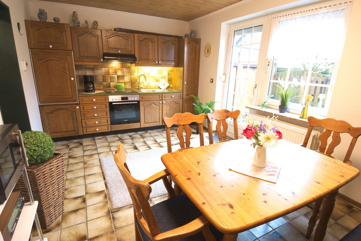 Das Ferienhaus hat 110 m² Wohnfläche und bietet für bis zu 5 Personen Übernachtungsmöglichkeiten. Es ist eine separate Küche mit Terassentür, 4 Stühle (sowie Hochstuhl) und gemütlichem Friesensofa vorhanden. Die Küchenzeile hat ein 4 Plattenherd, Backofen, Kühlschrank, eine Microwelle, Wasserkocher und Kaffeemaschine. Im Erdgeschoss befindet sich ein Gäste-WC, eine Waschmaschine und ein großes Wohnzimmer mit Sofa, SAT-Flachbild-TV. Internetzugang ist möglich (WLAN). Im Obergeschoss ist seit Februar ein neuer Fußbodenbelag und neue Betten im Elternschlafzimmer. Ein weiteres Zimmer mit 2 Einzelbetten, Kleiderschrank, einem kleinen Tisch und 2 Stühlen. Das Bad befindet sich in der 1. Etage und verfügt über eine Dusche, WC, 2 Waschbecken mit Spiegel sowie ein Fenster.