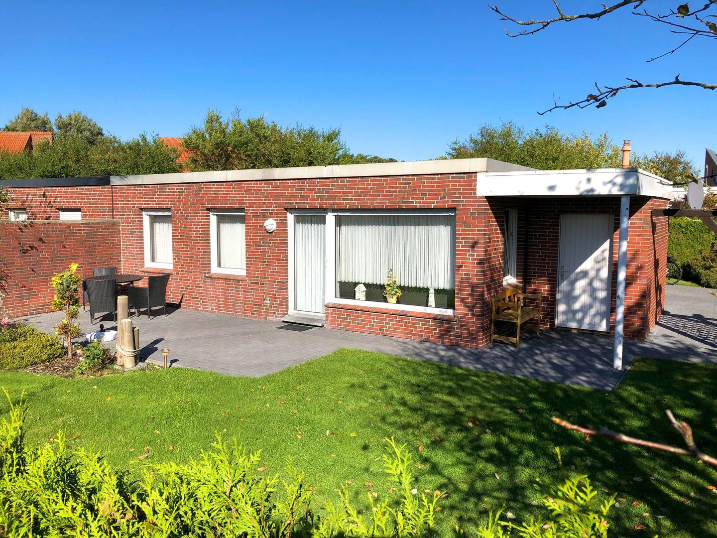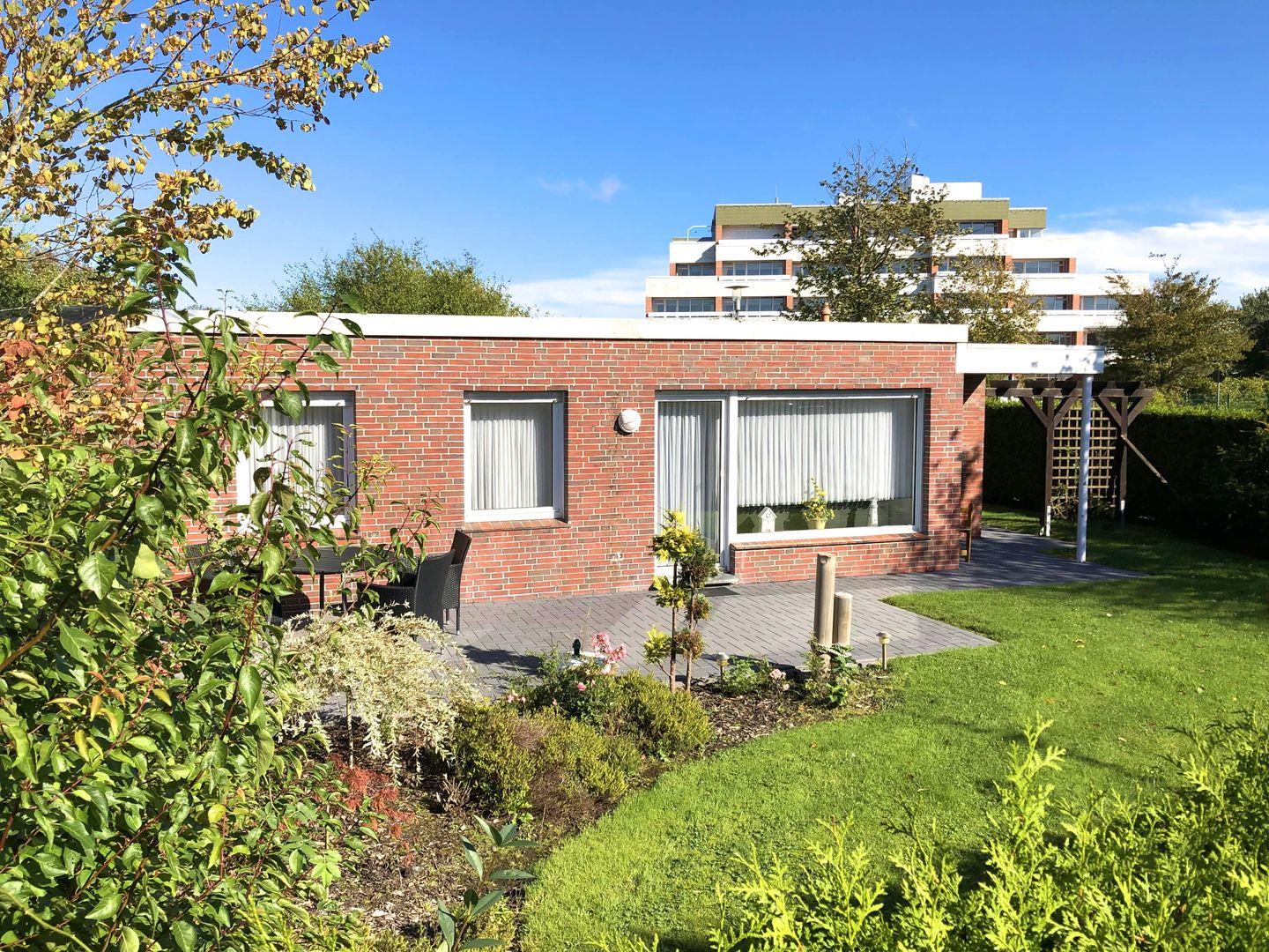 Strandnaher Ferienbungalow in Norddeich mit eingezäuntem Garten und Strandkorb.