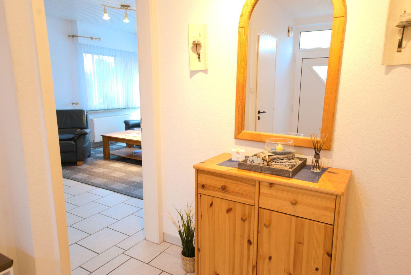 Das Ferienhaus ist ein ebenerdiger Bungalow in ruhiger Sackgassenlage und bietet für bis zu 3 Personen Schlafmöglichkeiten. Es verfügt über ein Elternschlafzimmer mit Doppelbett und ein zweites Schlafzimmer mit Einzelbett, beide mit Laminatboden. Das Wohnzimmer ist mit einer Ledercouch (3-Sitzer und 2 Sessel), einem Flachbild-SAT-TV und einem CD-Player ausgestattet. Die Küchenzeile bietet ein Ceranfeld mit Induktion, Mikrowelle, Wasserkocher, Kaffeemaschine sowie einem Gefrierfach im Kühlschrank. Das Badezimmer umfasst eine Dusche, WC und Waschbecken. Im Außenbereich lädt ein großer Garten, eine Terrasse mit Gartenmöbeln, Sonnenschirm und Strandkorb zum Entspannen/ Verweilen ein. Ein abschließbares Gartenhäuschen sowie ein Schuppen mit 2 Fahrrädern stehen zur Verfügung. Ein kostenfreier Parkplatz befindet sich direkt auf dem Grundstück vor der Haustür. WLAN und eine Waschmaschine sind ebenfalls vorhanden. Hunde sind herzlich willkommen.
