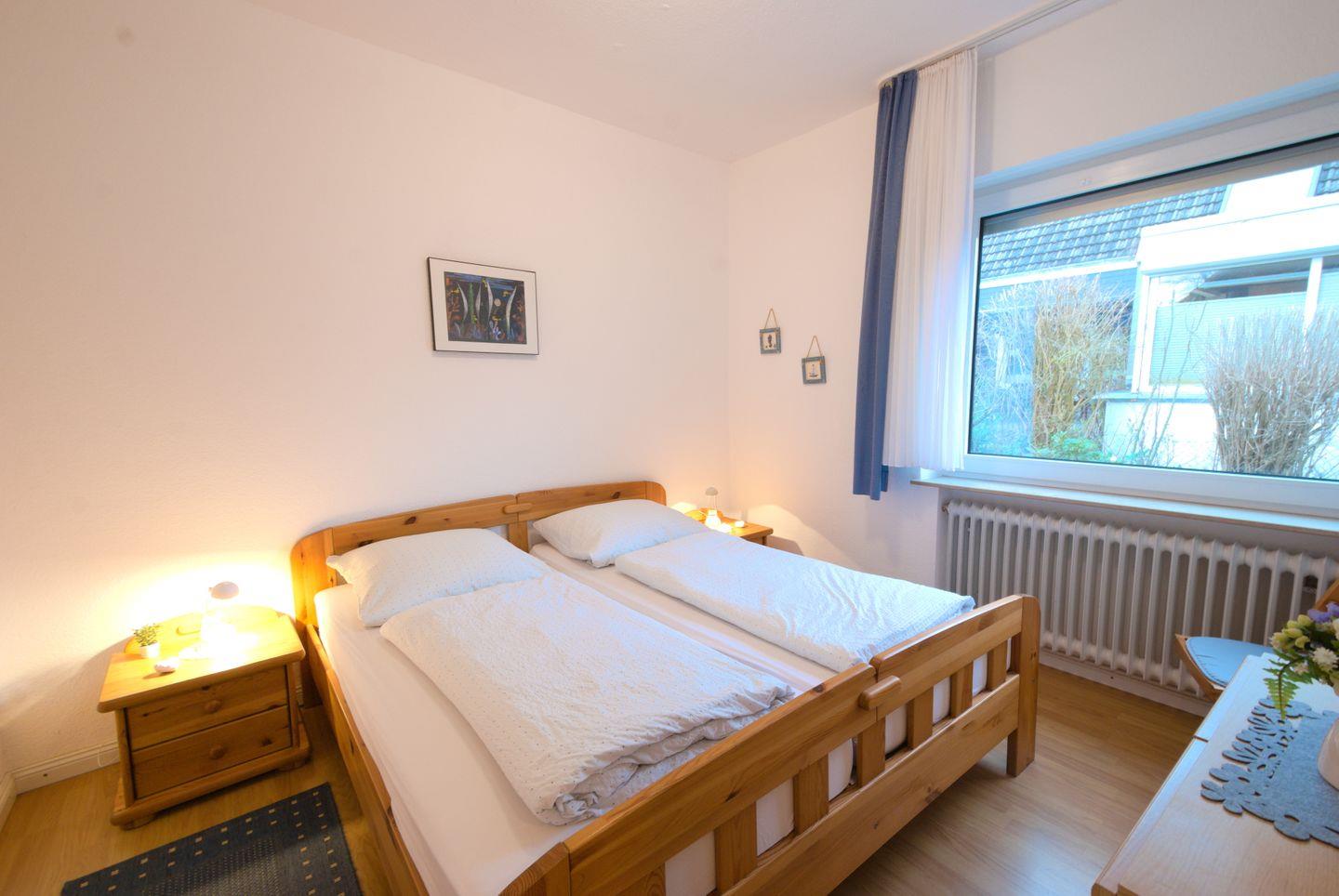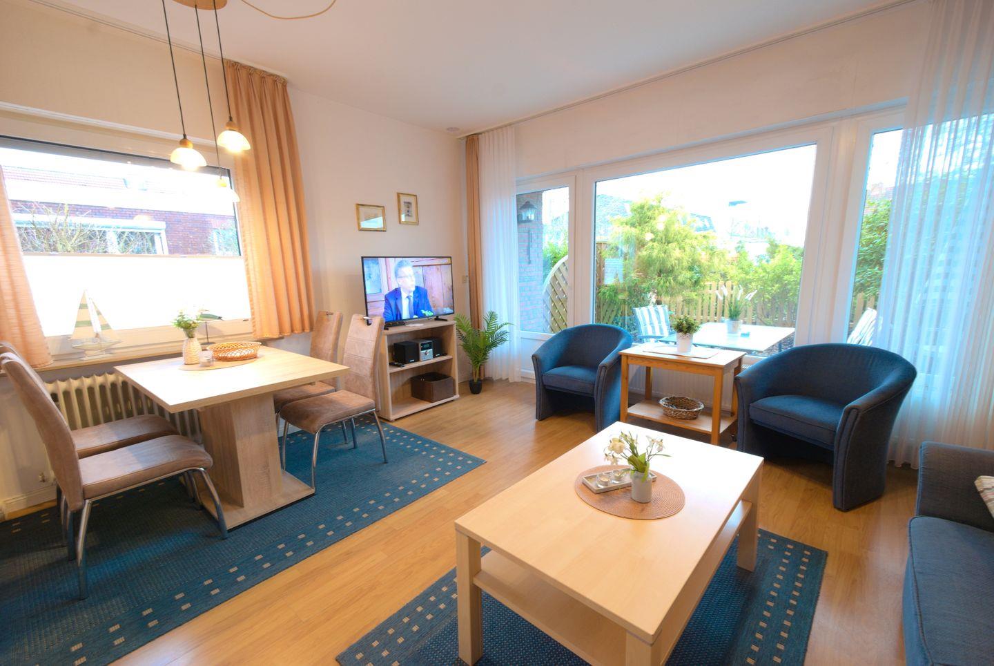 Die Ferienwohnung bietet ein gemütliches Wohnzimmer mit integrierter Küchenzeile, Essecke und einer ausziehbaren Schlafcouch. Zur Unterhaltung steht ein SAT-TV mit Flachbildschirm, DVD-Player und eine Stereoanlage zur Verfügung. Das Schlafzimmer ist mit einem Doppelbett ausgestattet. Das Bad verfügt über eine Dusche, WC und Waschbecken. Die Terrasse mit einem gepflegten Gärtchen lädt zum Entspannen ein. Ein Parkplatz befindet sich vor dem Haus, und Fahrräder können im Gemeinschaftsschuppen abgestellt werden. Bis zum Deich sind es nur 650 m, und in 5-10 Gehminuten erreichen Sie die Bäckerei sowie das Spaßbad "Ocean Wave". Ein Bügelbrett und Bügeleisen sind ebenfalls vorhanden. Hunde sind herzlich willkommen.