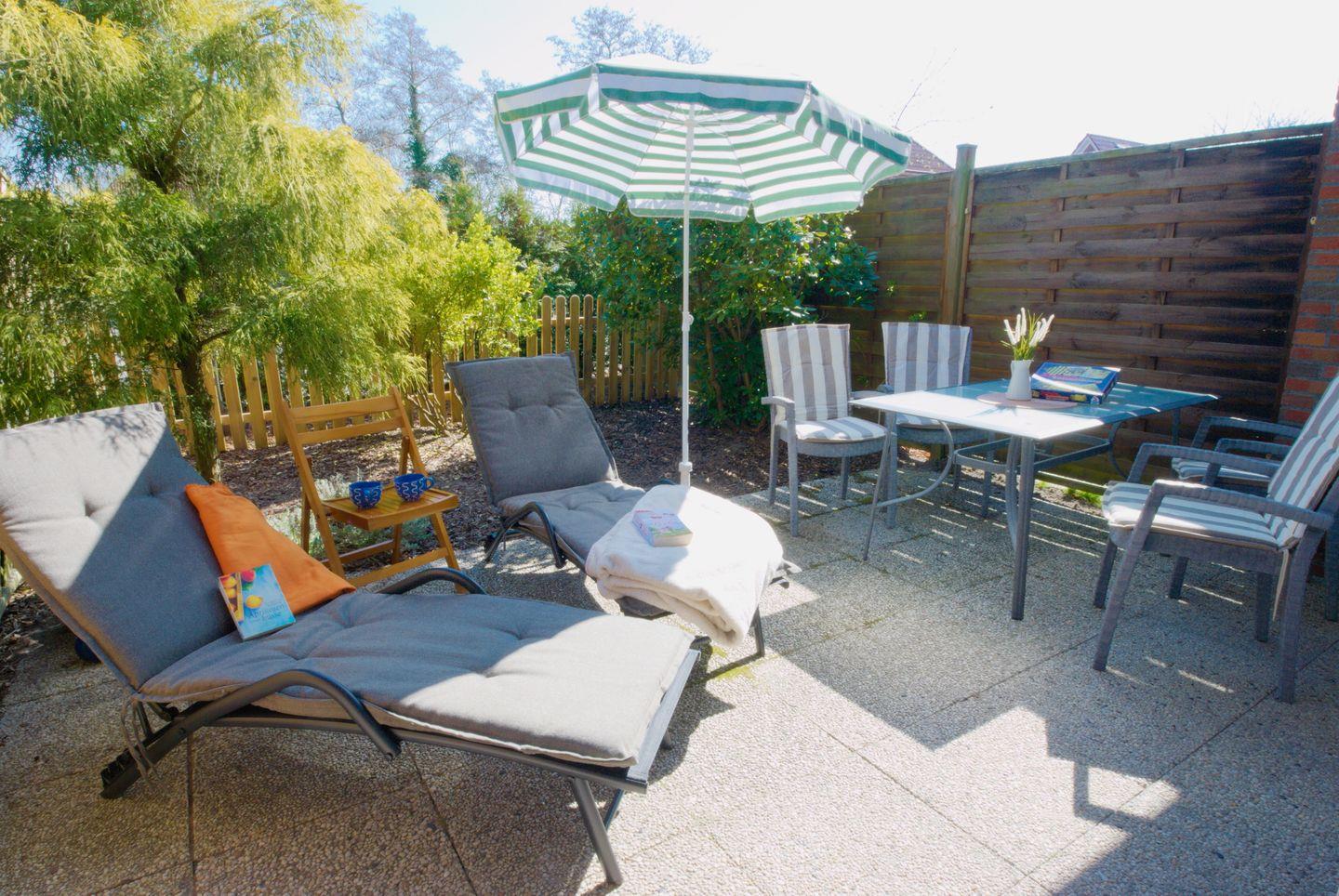 Ferienwohnung mit ruhiger Terrasse, nur 650 m vom Deich entfernt.