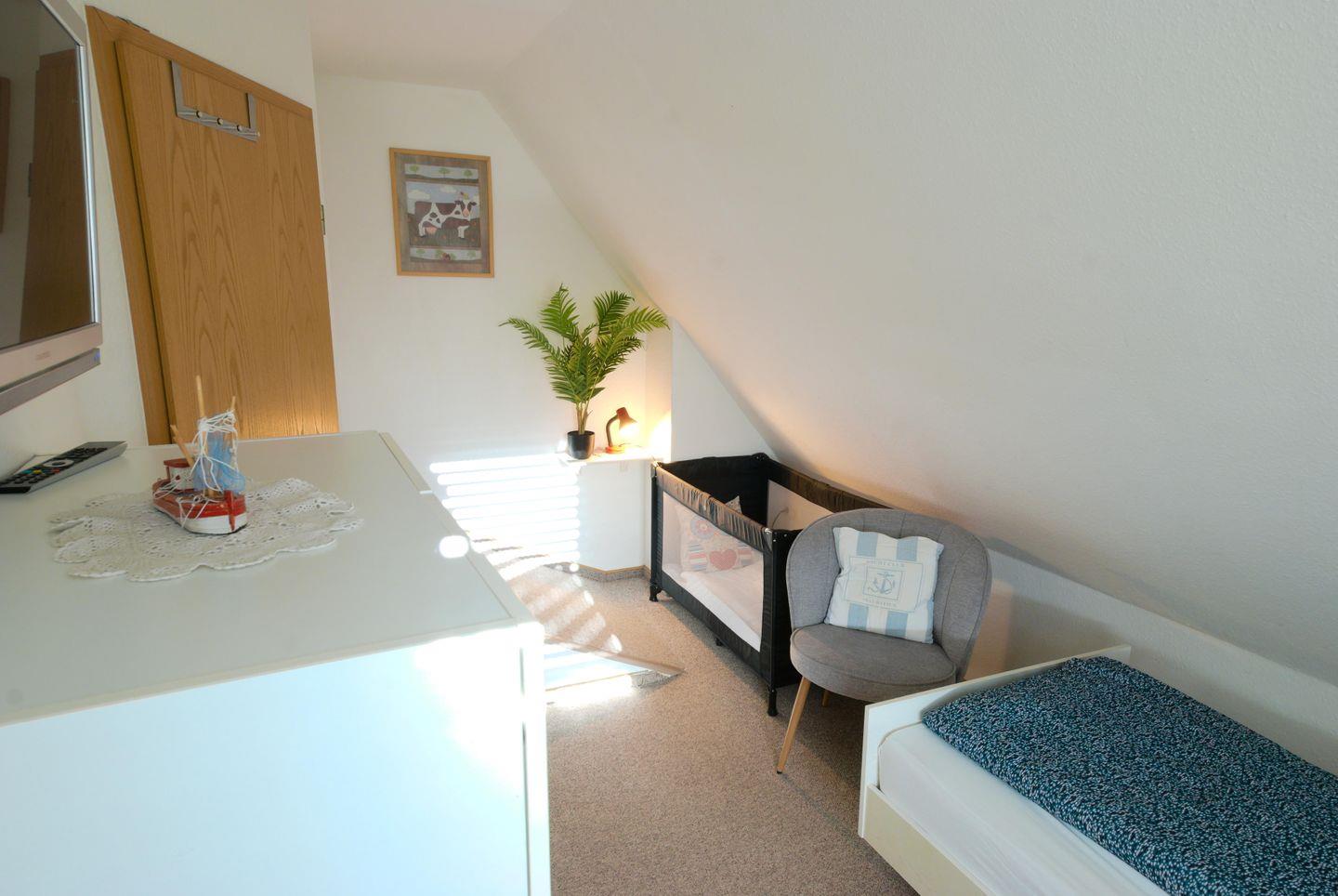 Im ersten Stock befindet sich das Elternschlafzimmer, während das Kinderzimmer mit einem Bett, Schrank und TV nebenan liegt. Im zweiten Stock gibt es ein weiteres Schlafzimmer mit zwei Betten und Kleiderschrank, ein Babyreisebett kann auf Wunsch bereitgestellt werden. Das Badezimmer mit Dusche und WC befindet sich in der ersten Etage, ein weiteres WC ist im Erdgeschoss vorhanden. Eine Waschmaschine ist vorhanden.