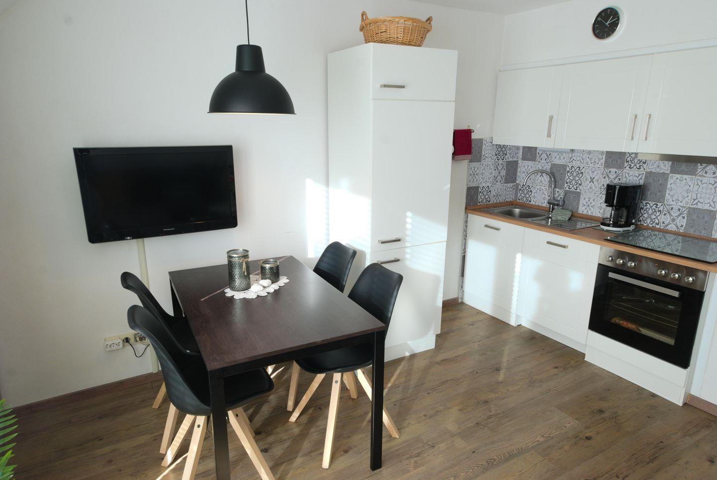 Die gut ausgestattete Küche lässt keine Wünsche offen und enthält ein Ceran-Kochfeld, einen Backofen, eine Spülmaschine, eine Mikrowelle, Kühlschrank sowie eine Kaffeemaschine – alles, was Sie für die Zubereitung von Mahlzeiten benötigen. Vom Wohnzimmer aus gelangen Sie auf den Balkon, der mit einem Tisch und vier Stühlen ausgestattet ist und zum Entspannen im Freien einlädt.