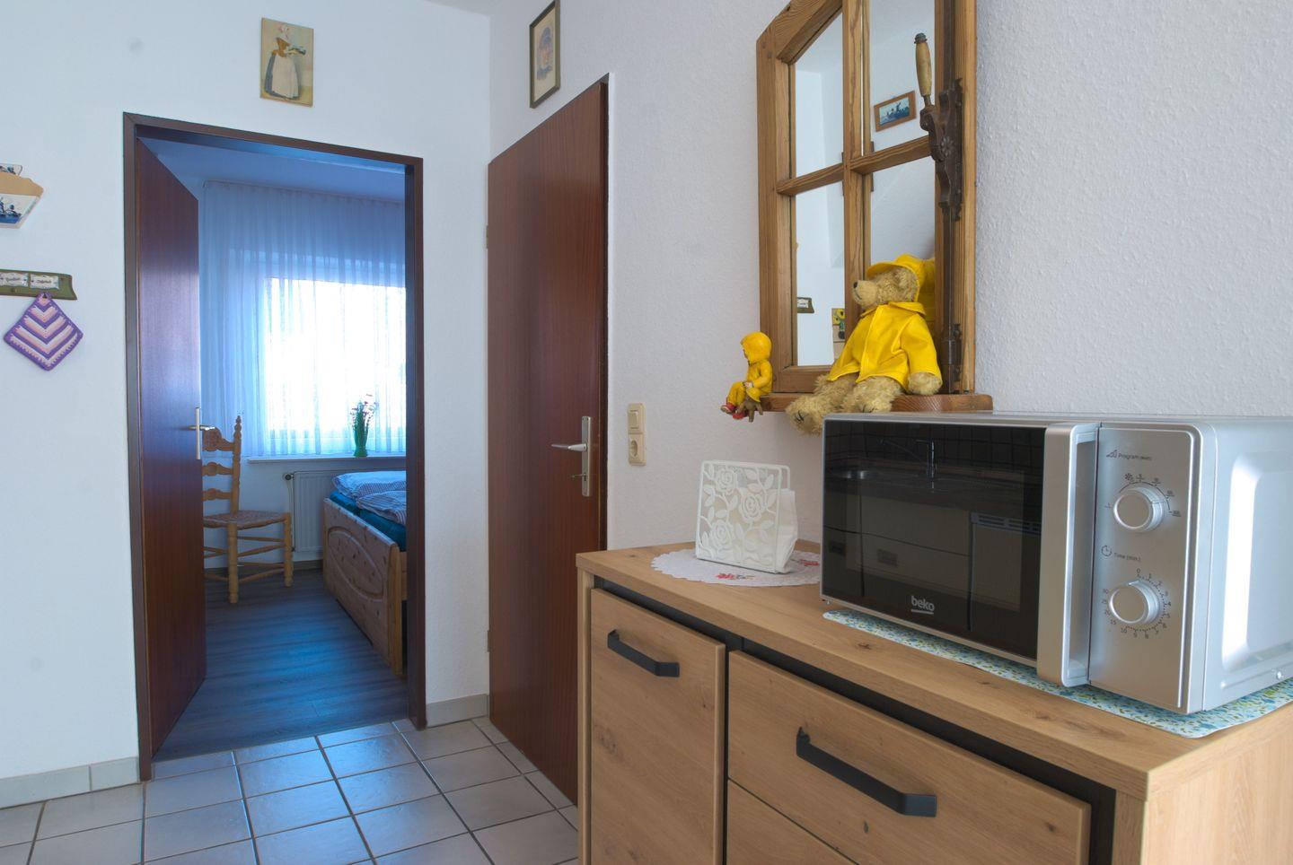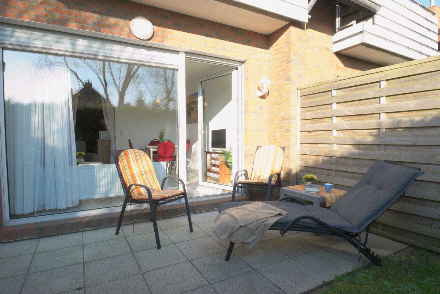 Die Ferienwohnung bietet auf 45 m² Platz für 2 Personen und befindet sich im Erdgeschoss. Sie verfügt über ein separates Schlafzimmer sowie ein Wohnzimmer mit Flachbild-TV und Radio. Die Küchenzeile ist mit Mikrowelle, Kühlschrank, 4 Plattenherd, Kaffeemaschine, Wasserkocher und Toaster ausgestattet. Das Bad bietet eine Dusche, WC und einen Fön. Für Ihre Entspannung steht eine Terrasse mit Gartenmöbeln und Sonnenschirm bereit. Ein PKW-Stellplatz befindet sich direkt vor dem Haus, und ein abschließbarer Schuppen ist ebenfalls vorhanden. Internetzugang ist verfügbar. Der Deich und Strand sind nur 5 Minuten zu Fuß entfernt. In der Nähe finden Sie das Schwimmbad, eine Minigolfanlage, eine Seehund-Aufzuchtstation, Indoor- und Outdoor-Spielplätze sowie Bäckereien und Restaurants. Der Fähranleger für die Inseln Juist und Norderney ist in ca. 25 Minuten zu Fuß erreichbar. Auch die Deutsche Bahn fährt bis zum Fähranleger.