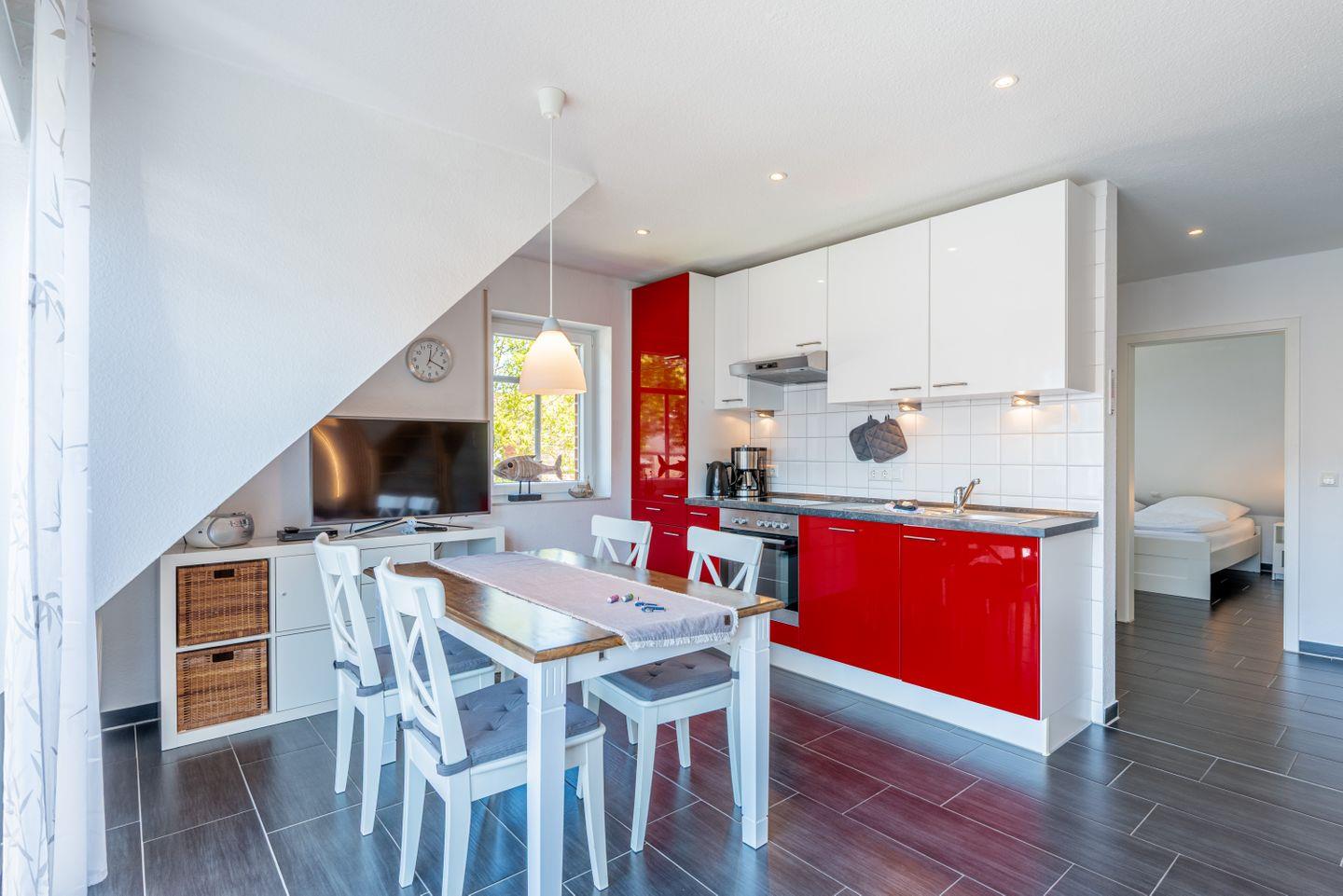 Das gemütliche Schlafzimmer bietet Platz für zwei Personen, während die moderne, offene Küche mit Essbereich und stilvollem Wohnzimmer zum Verweilen einlädt. Auf der bequemen Sofaecke kannst du entspannen und den Fernseher mit DVD-Player für gemütliche Abende nutzen.