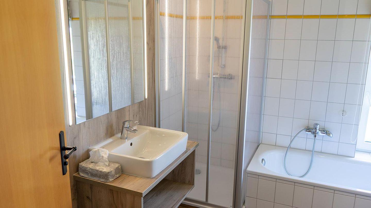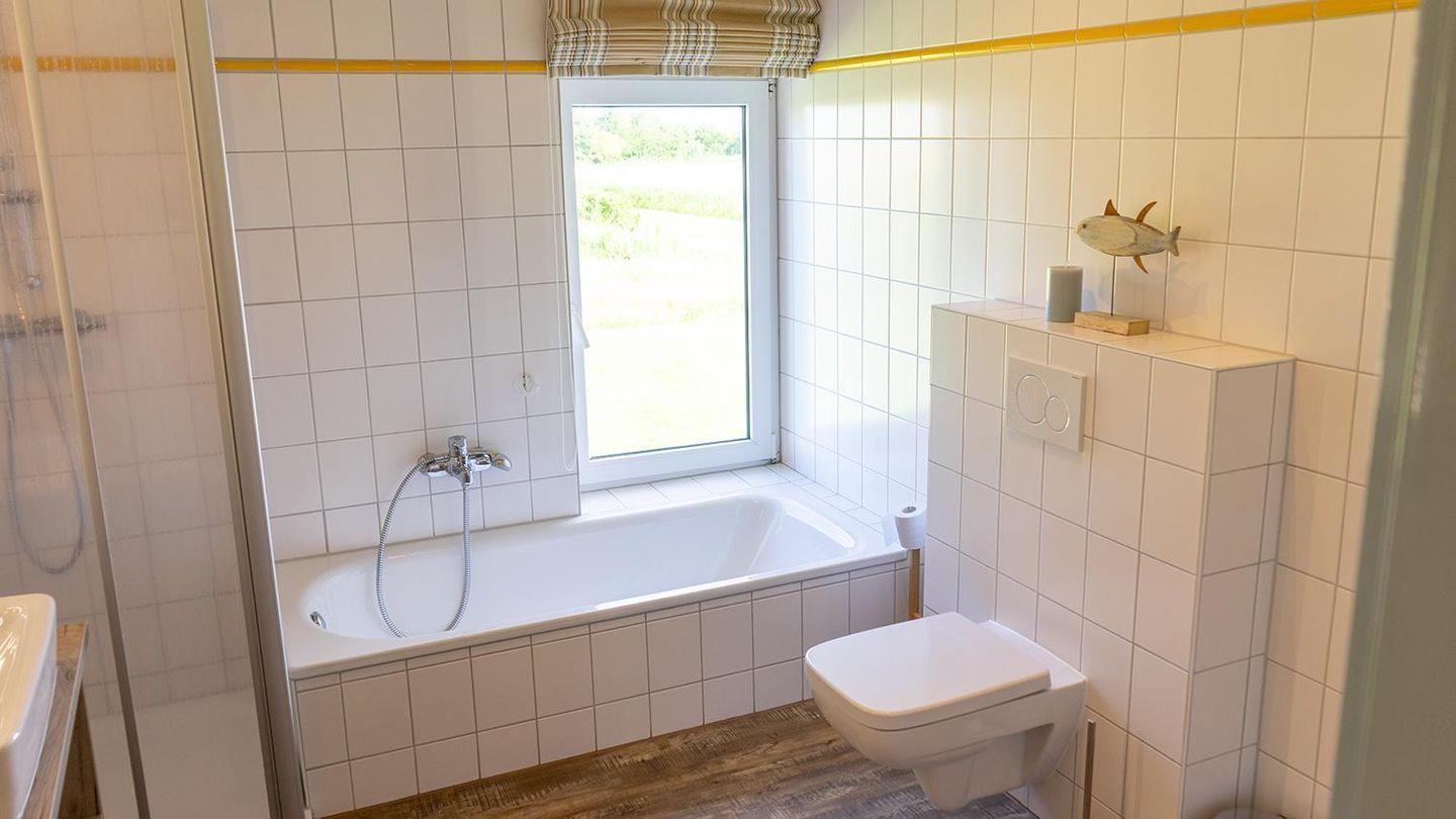 Das großzügige Badezimmer mit Badewanne und Dusche lädt zum Wohlfühlen ein, und eine zusätzliche Gästetoilette sorgt für extra Komfort.