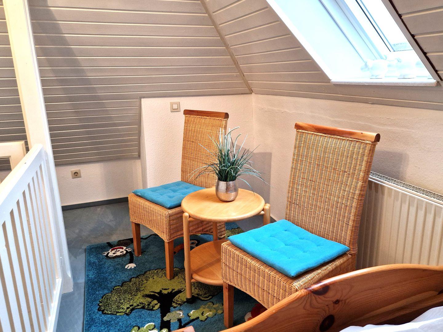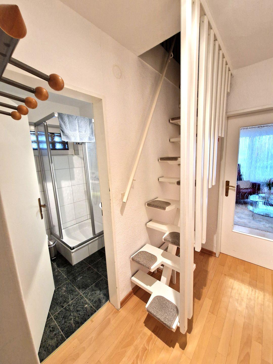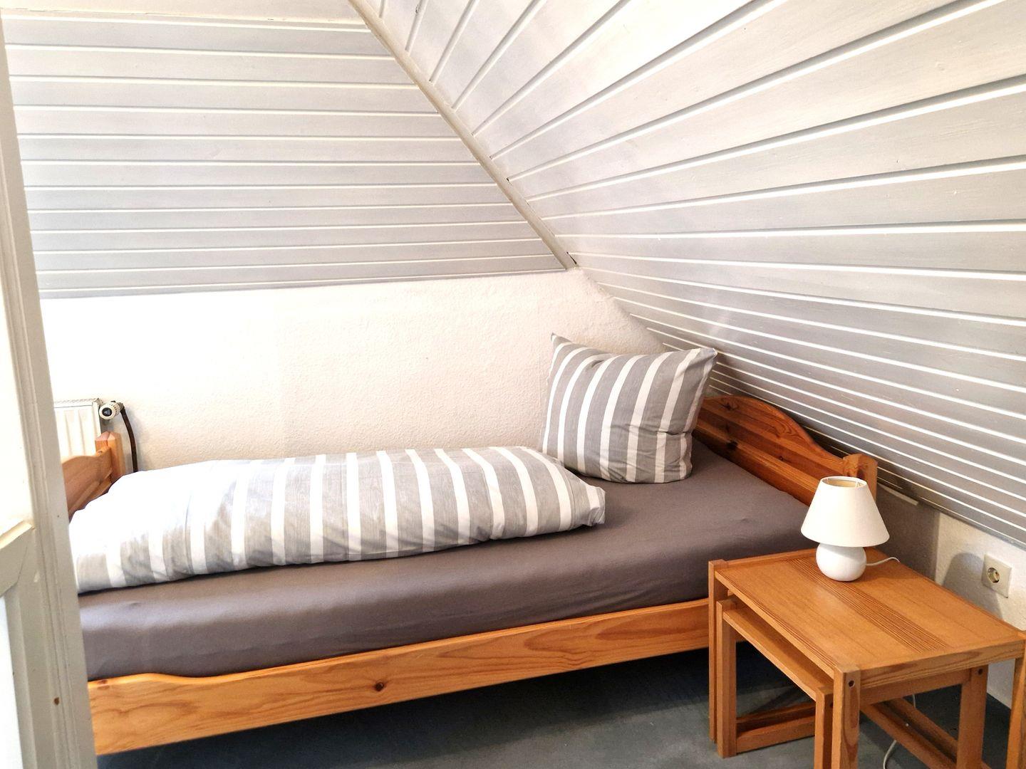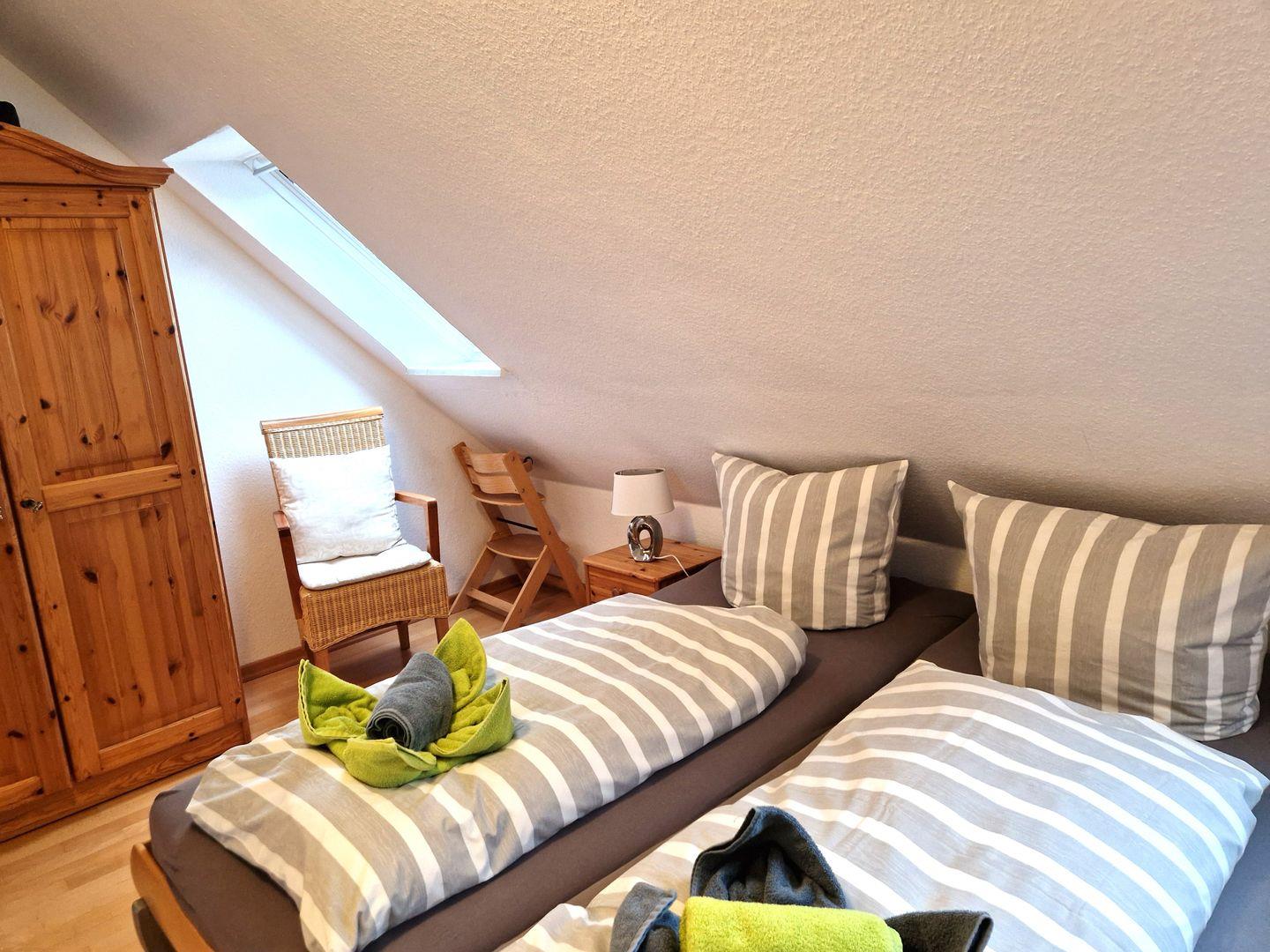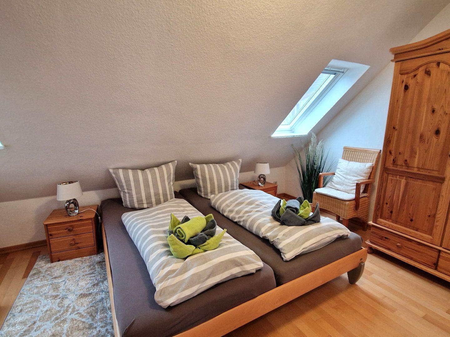 Weiter gehören zur Wohnung 2 freundliche Schlafzimmer. Eins mit einem Doppelbett. Das zweite Schlafzimmer mit 2 Einzelbetten im ausgebauten Dachgeschoss ist über eine Raumspartreppe zu erreichen.