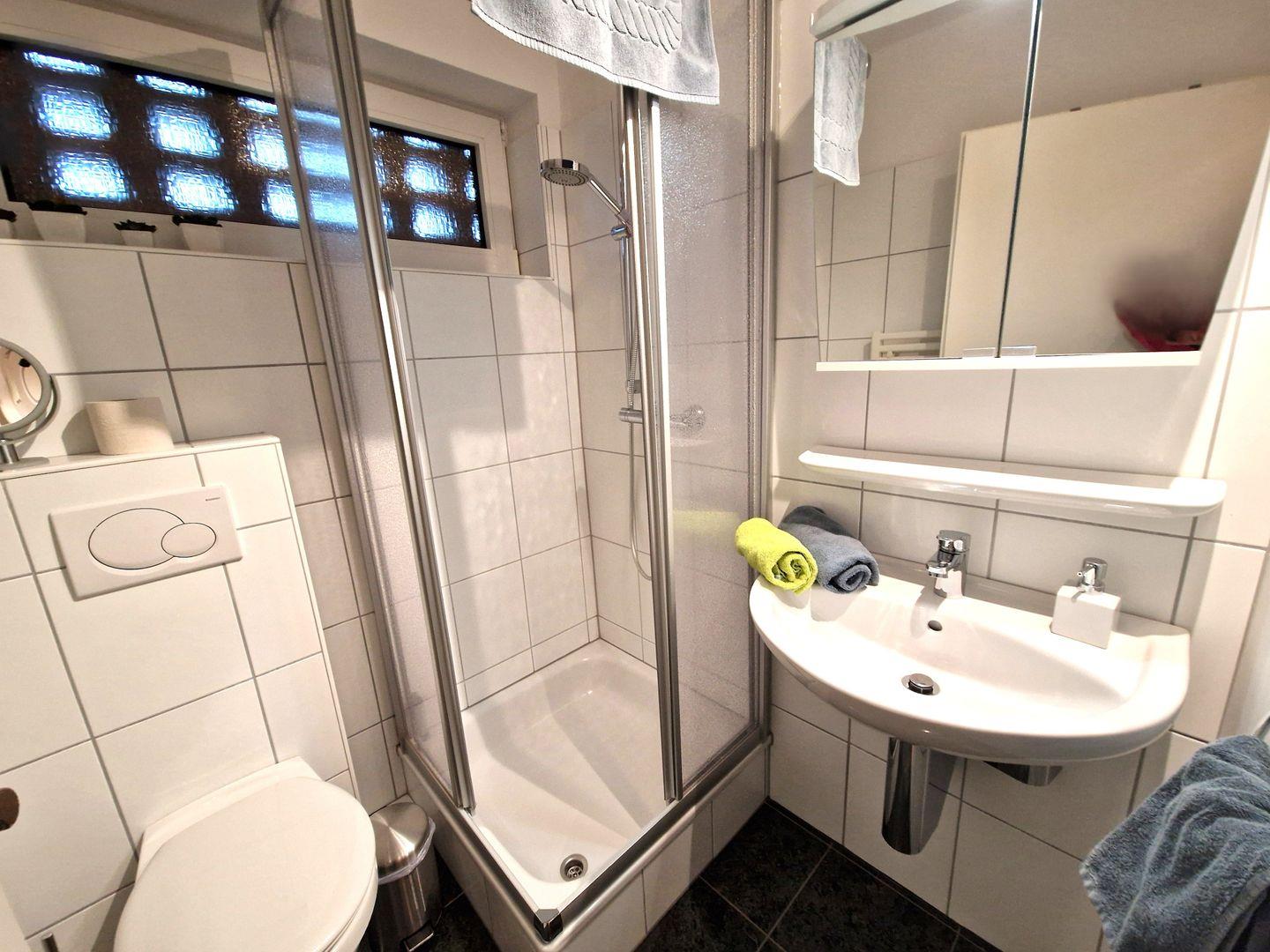 Das moderne Badezimmer hat eine Dusche, Waschbecken und WC.