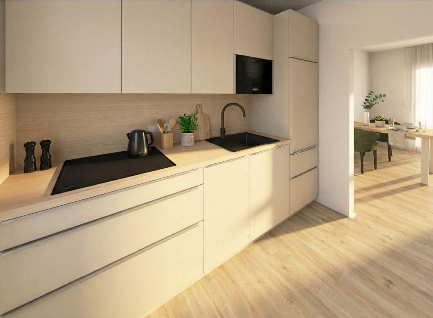 - Voll ausgestattete Küchenzeile mit Kühlschrank, Herd und diversen Kochutensilien