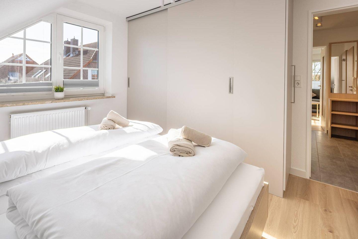 Im separaten Schlafzimmer befindet sich ein komfortables Doppelbett (180 × 200 cm) sowie ein Kleiderschrank mit ausreichend Stauraum.