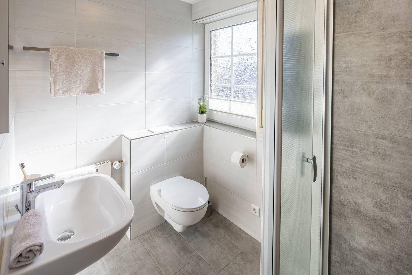 Badezimmer mit Dusche, WC, Waschbecken und Spiegel