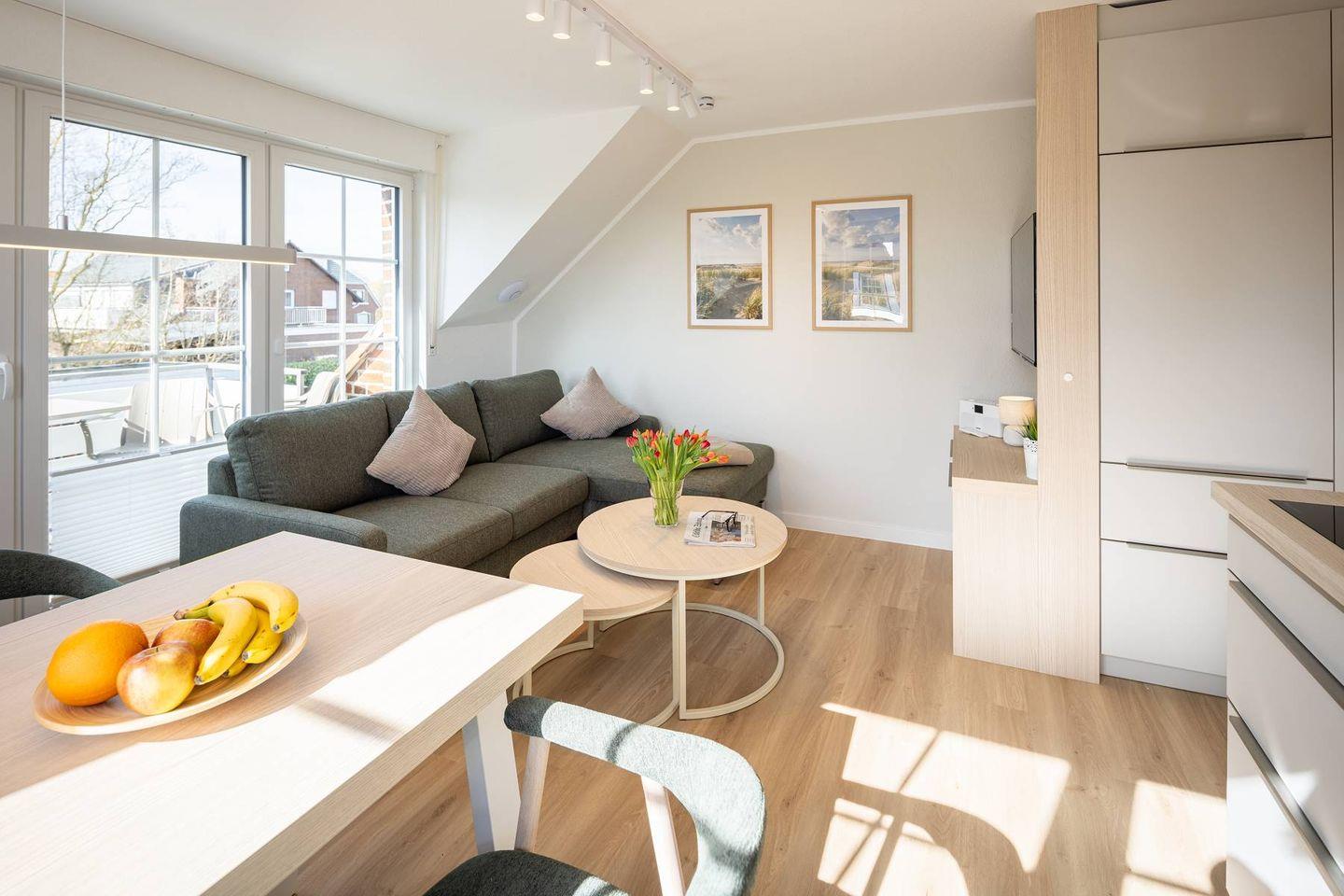 Ein besonderes Highlight ist der Südwest-Balkon, der direkt vom Wohnbereich aus zugänglich ist. Hier genießen Sie sonnige Nachmittage und ruhige Abendstunden in geschützter Atmosphäre – perfekt für eine kleine Auszeit an der frischen Nordseeluft.